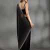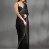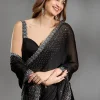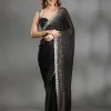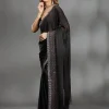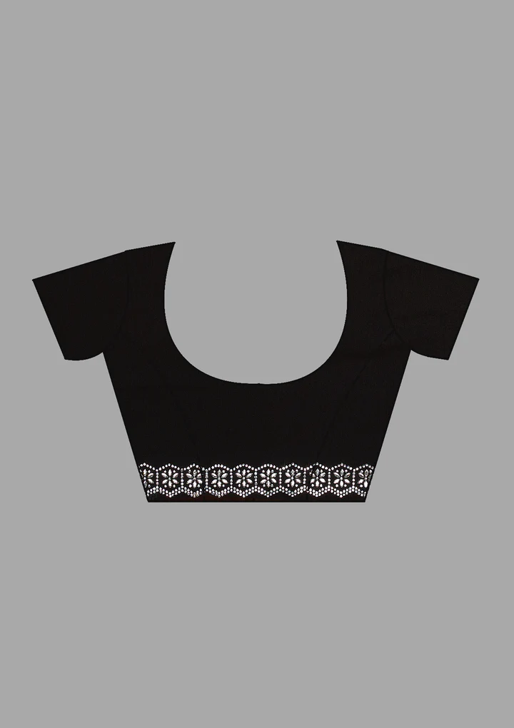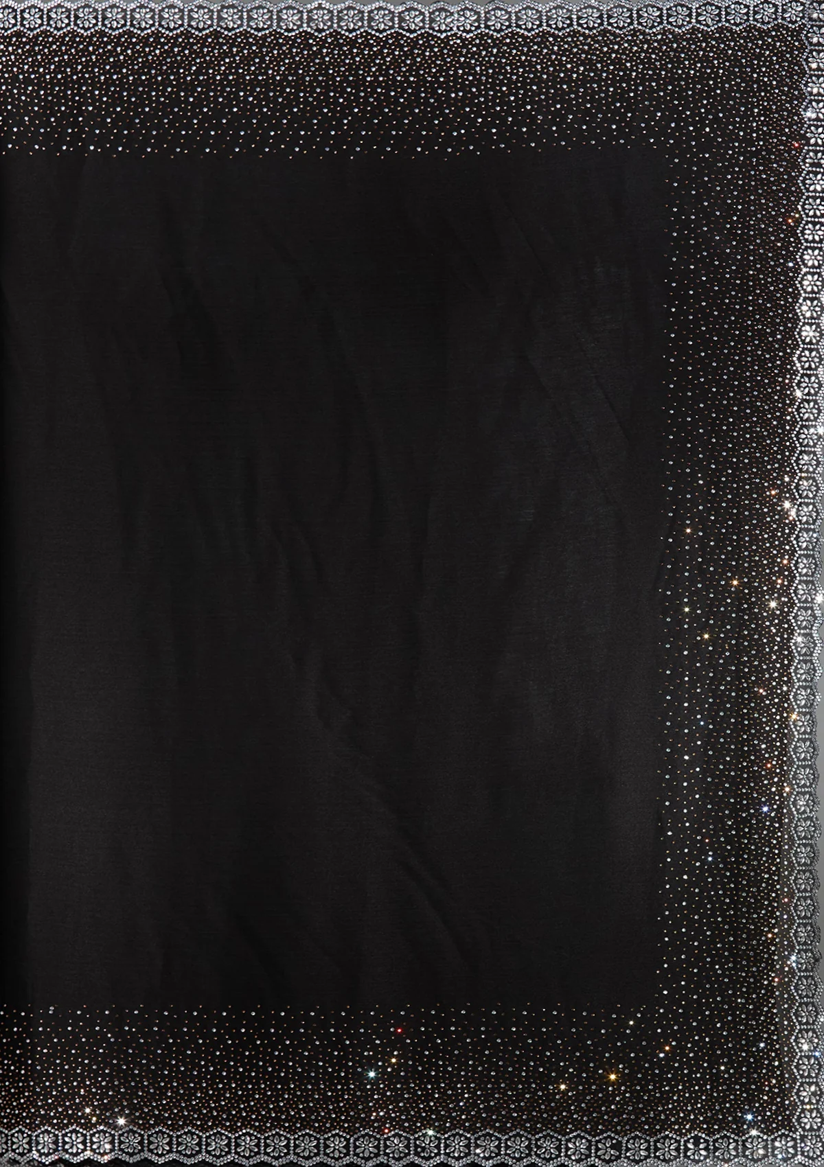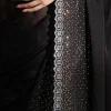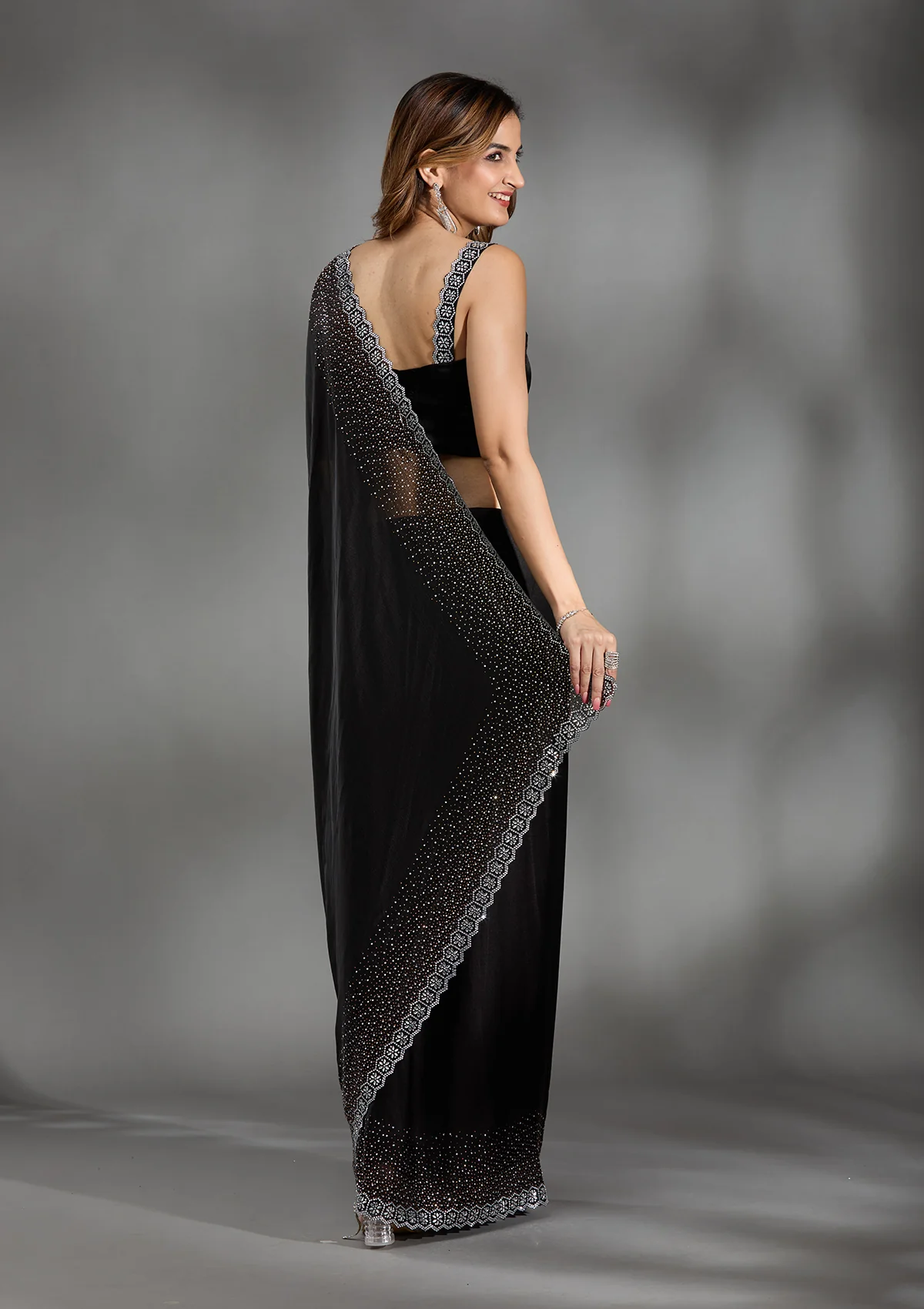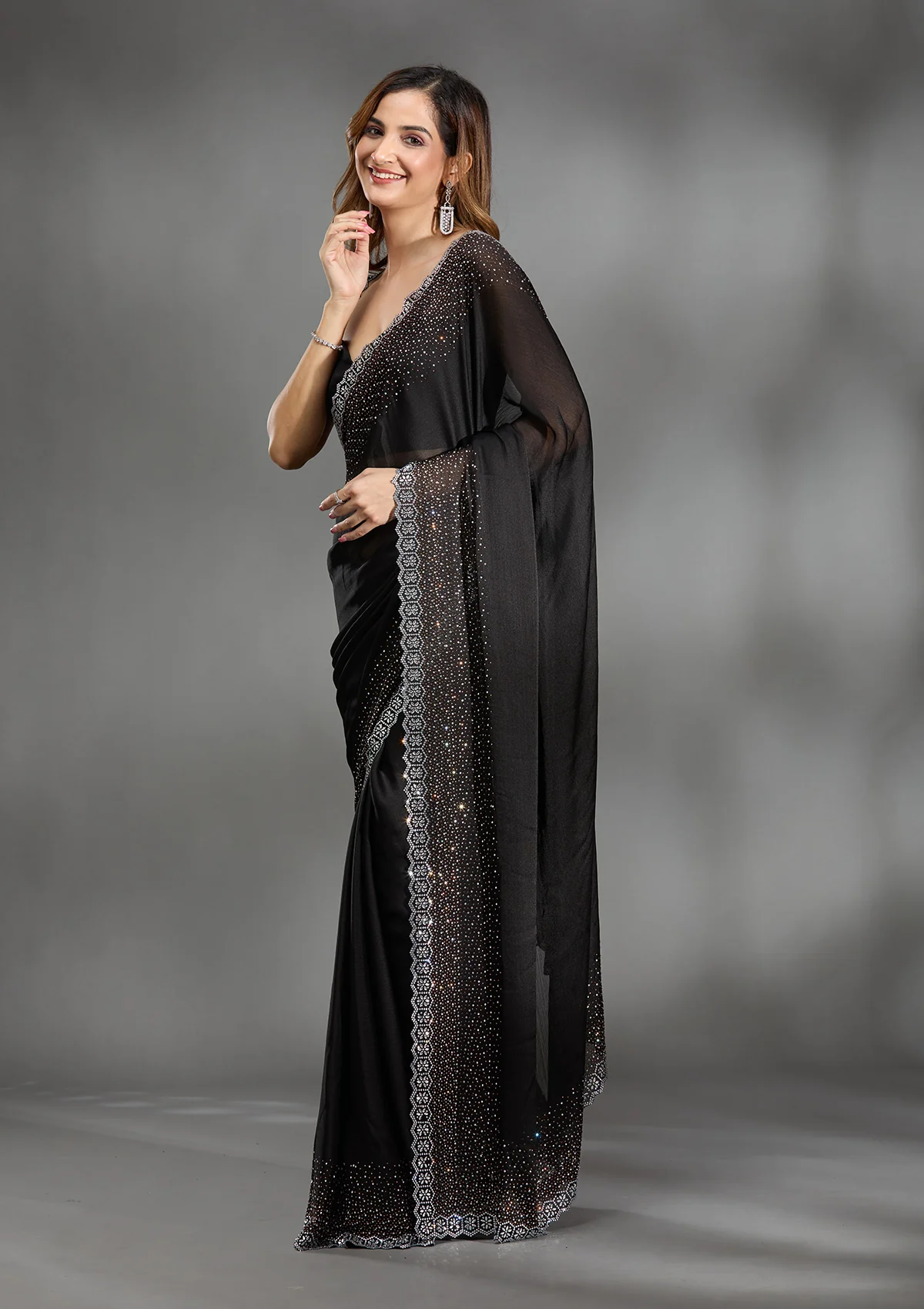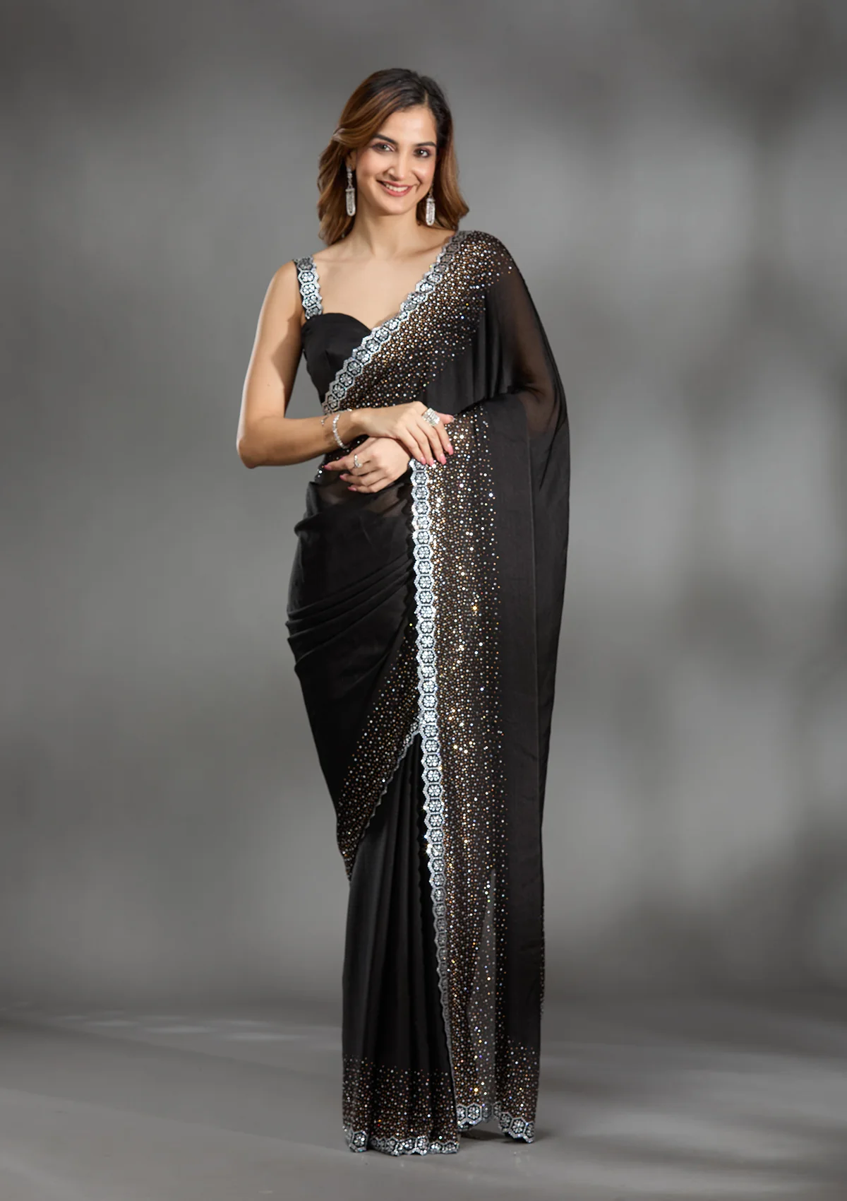 Black Saree in Chiffon fabric The Saree is elevated with Stonework embroidery It comes with an Unstitched blouse Comes with the Wearfella Trends promise of premium quality.