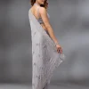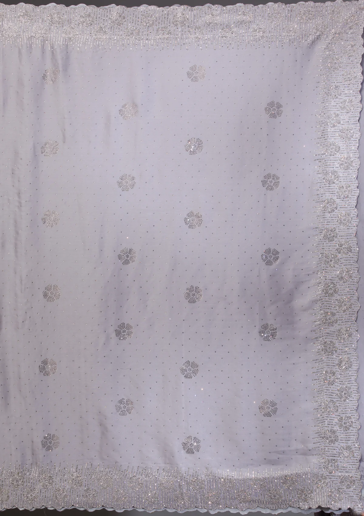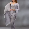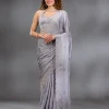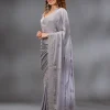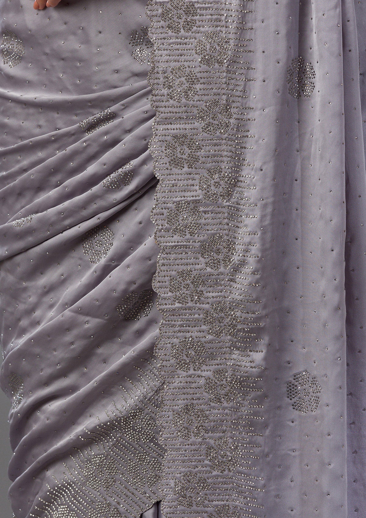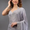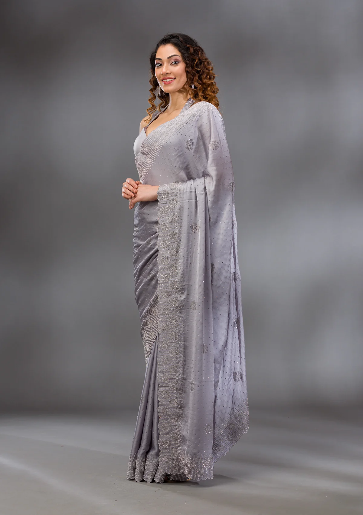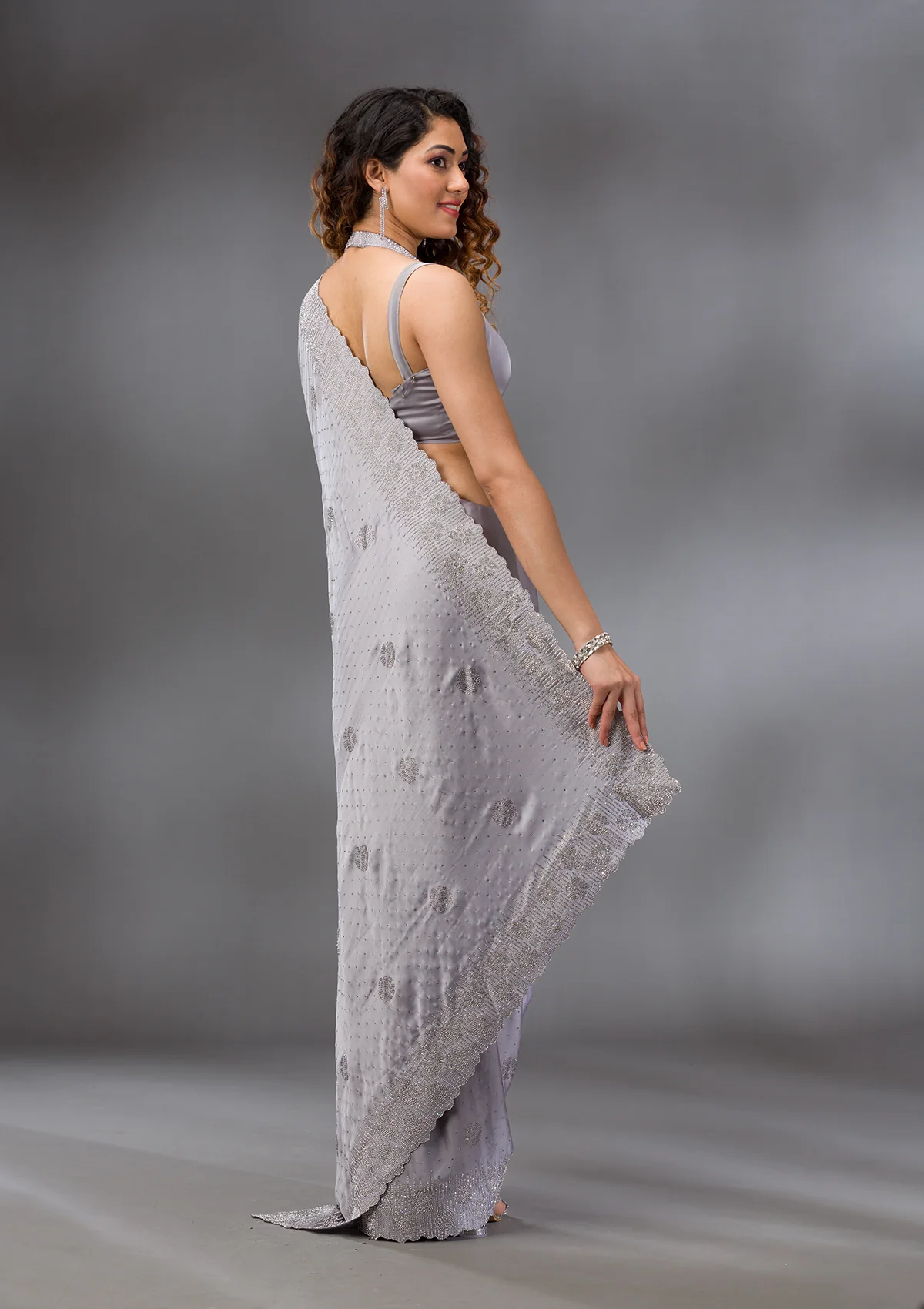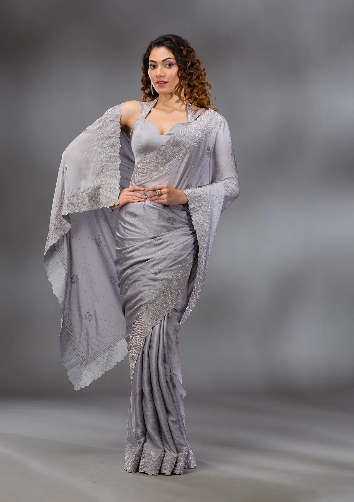 Grey Saree in Satin fabric The Saree is elevated with Swarovski embroidery It comes with an Unstitched blouse Comes with the Wearfella Trends promise of premium quality.