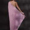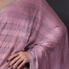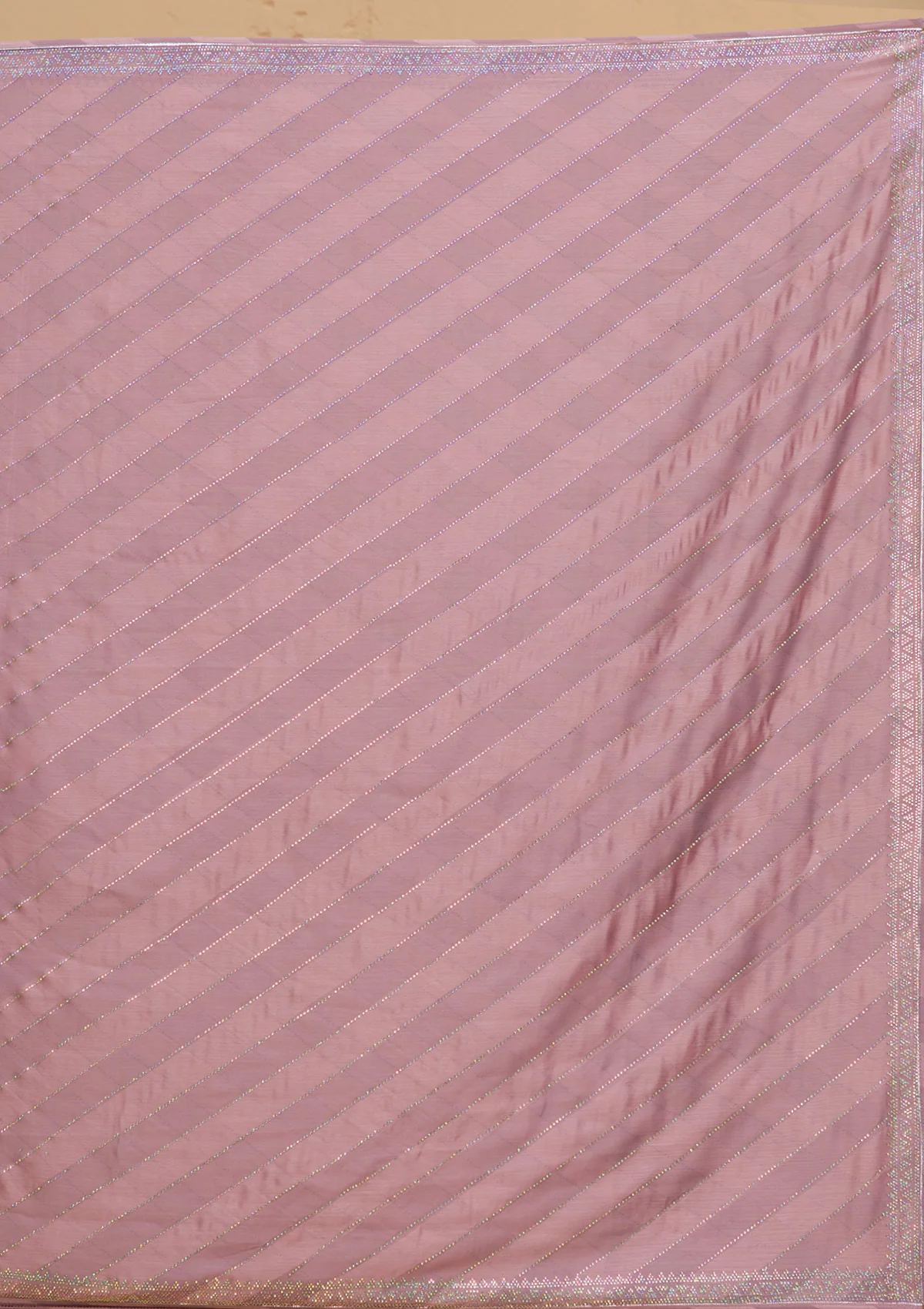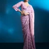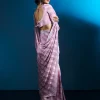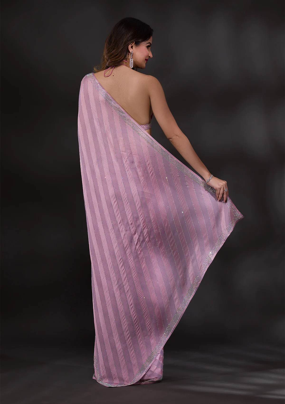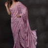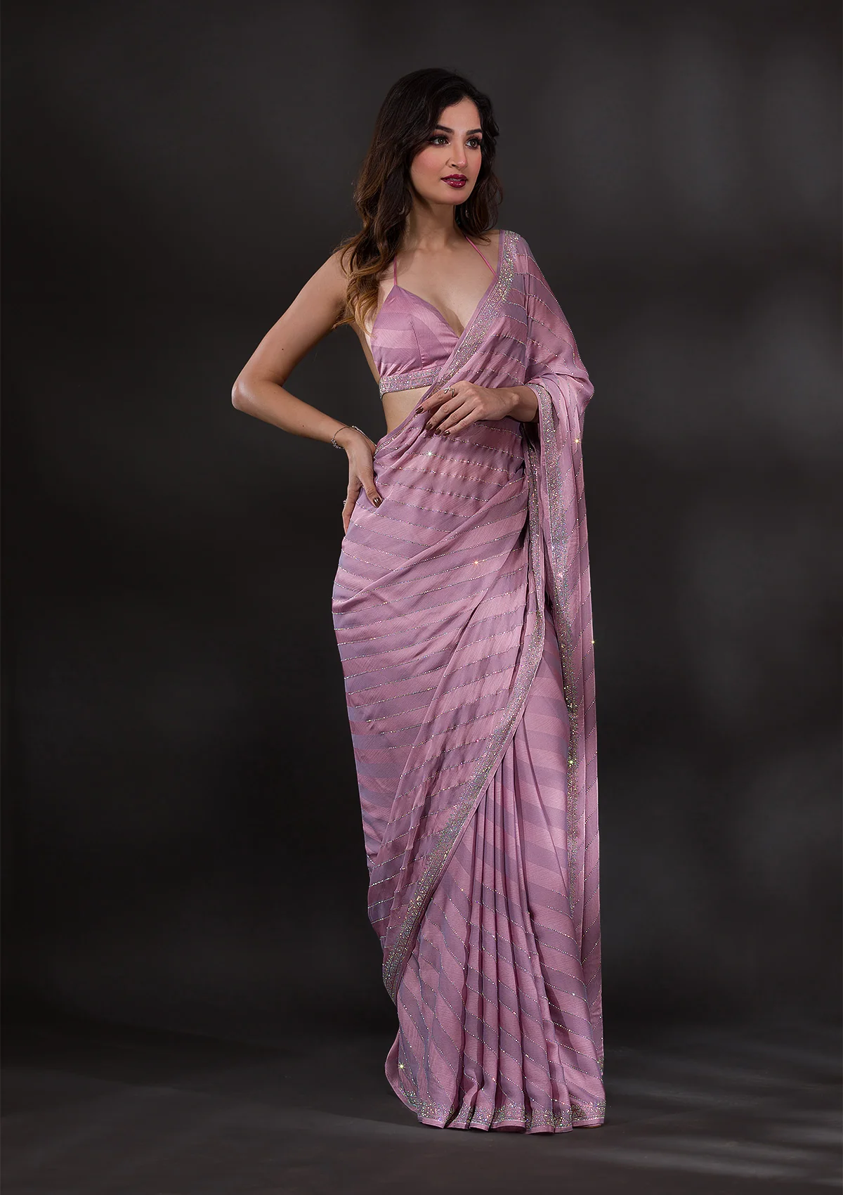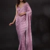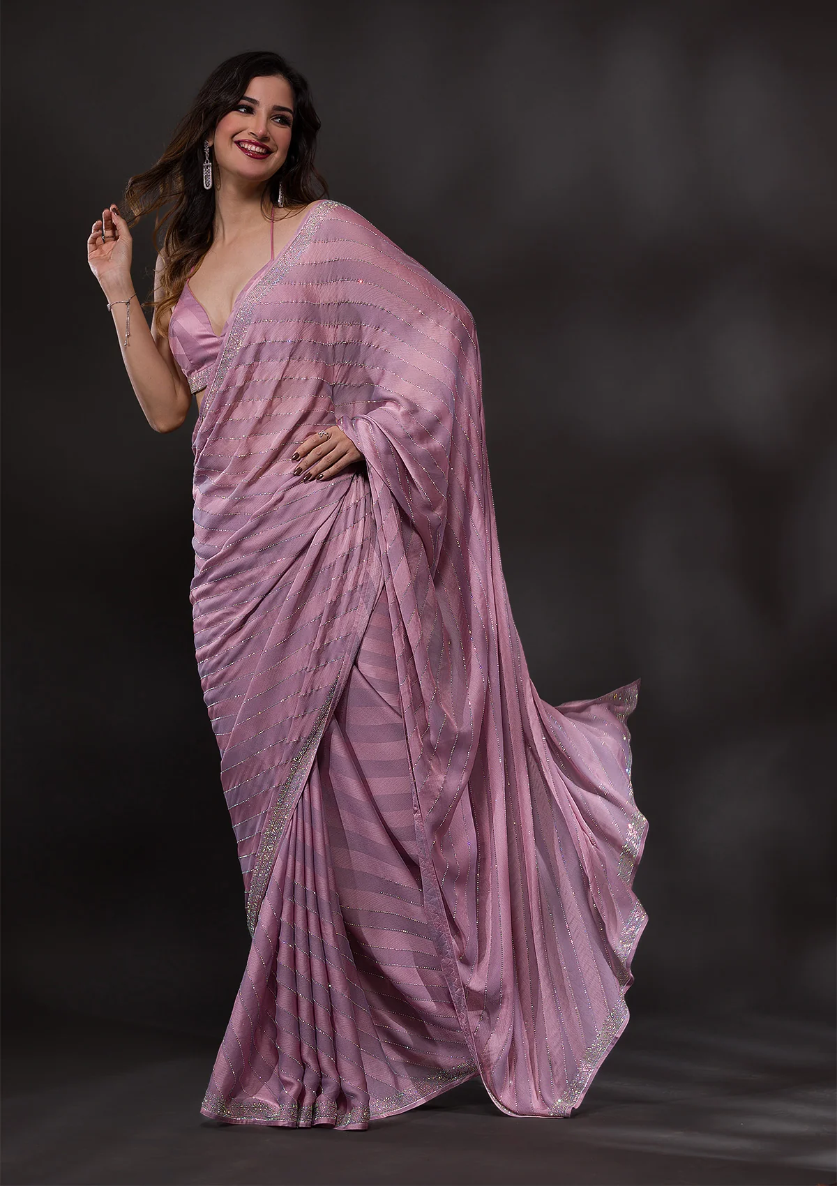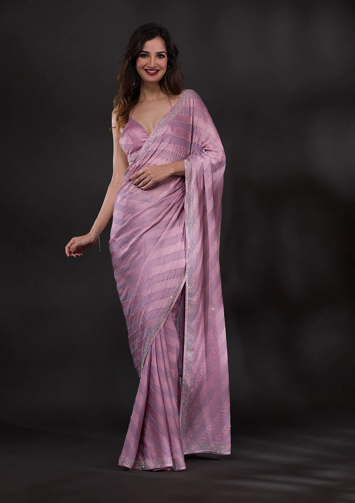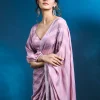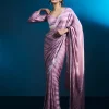 Fulfill all your wishes with this dreamy saree. The satin fabric comes with self-designed stripes detailing, and the stonework adds a touch of glamour. We highly recommend these romantic hues of pink for a drop-dead look on your first date. . This party wear saree is also ideal for your reception, engagement, or cocktail events, offering a subtle yet sophisticated appearance. . It comes with a matching unstitched blouse piece.