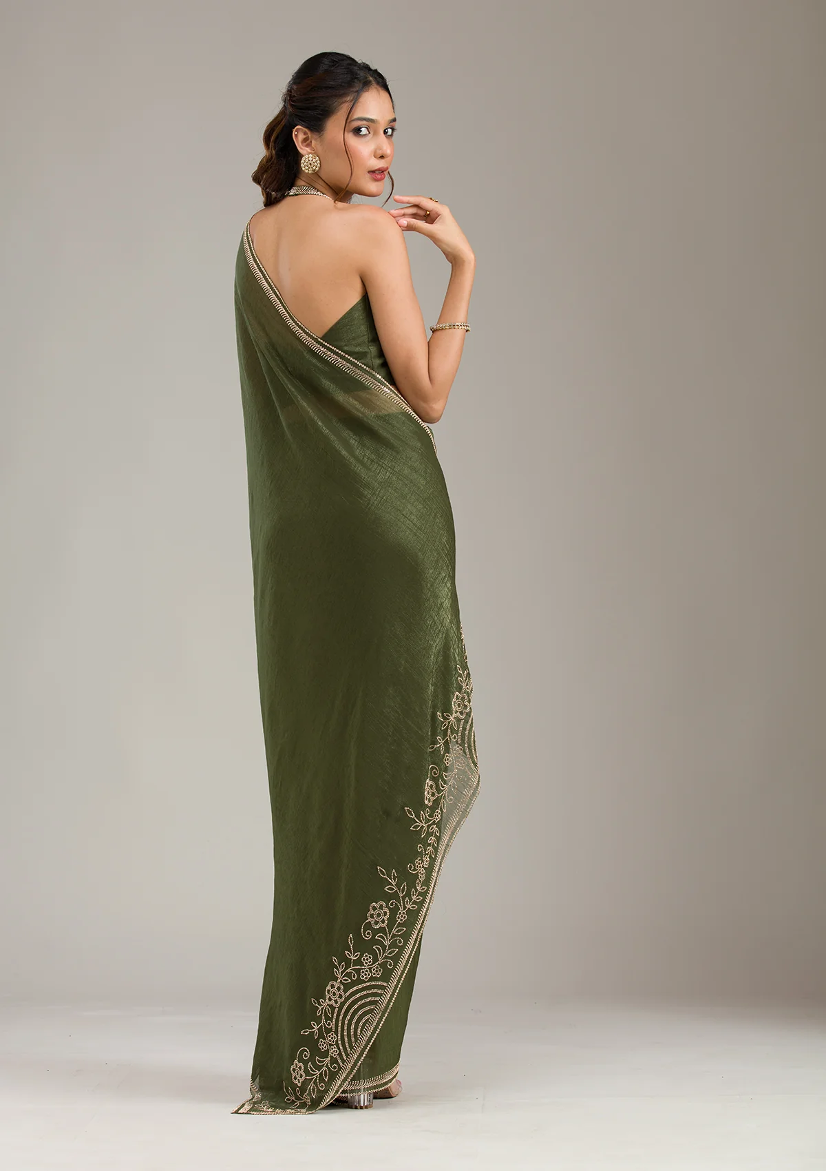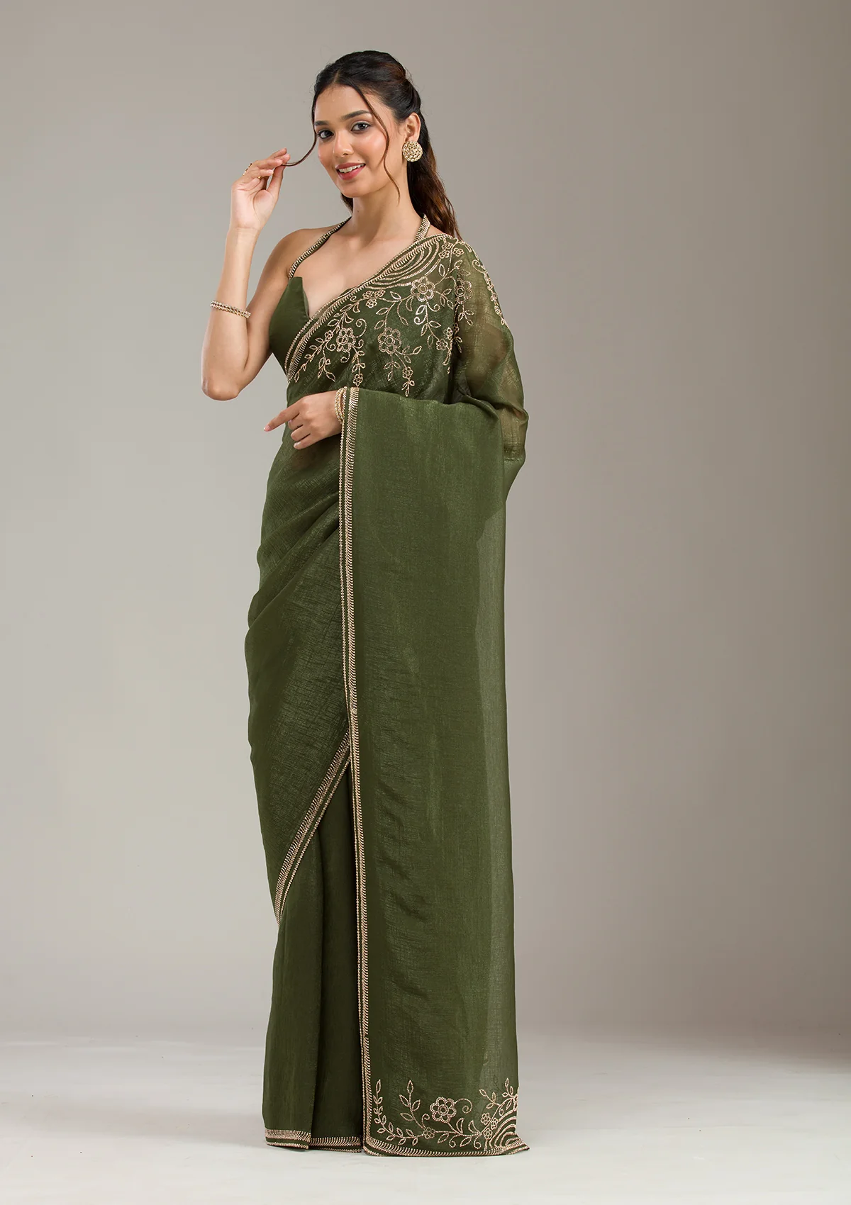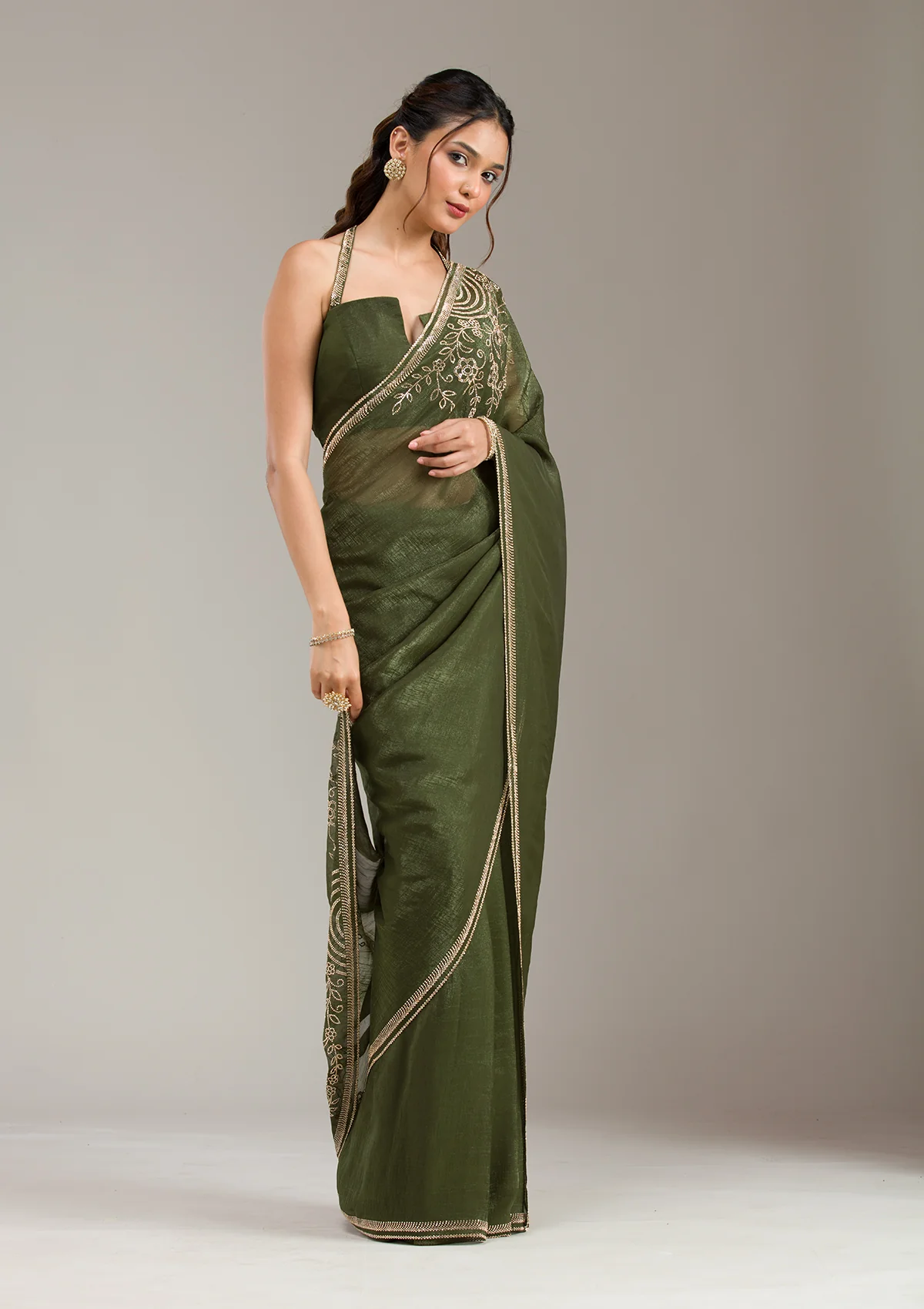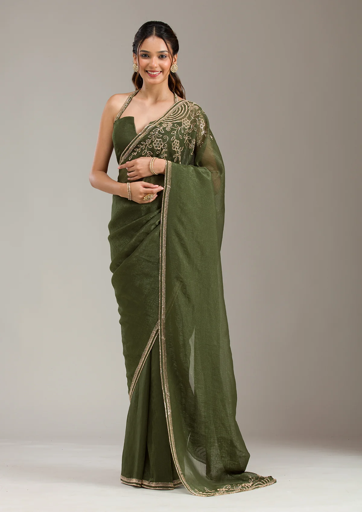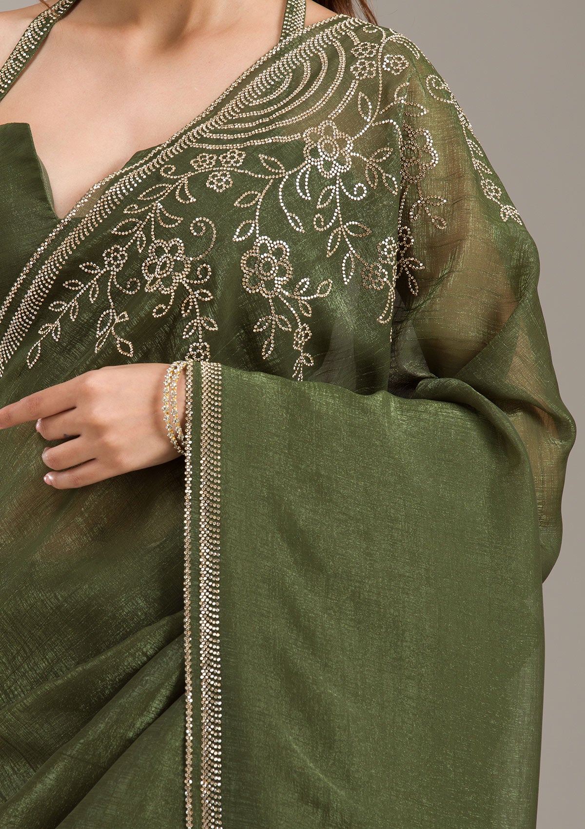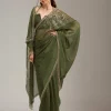 Mehendi Saree in Tissue fabric. The Saree is elevated with Stonework (Gold) embroidery. It comes with an Unstitched blouse. Comes with the Wearfella Trends promise of premium quality.
