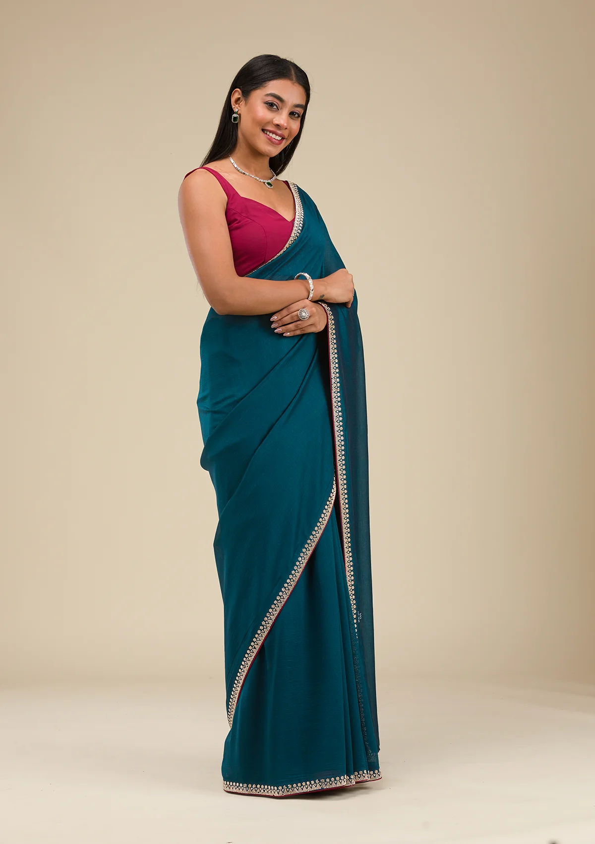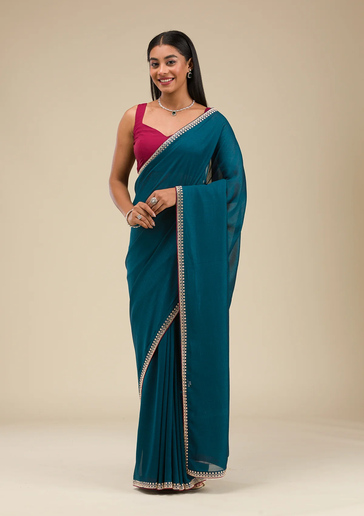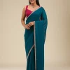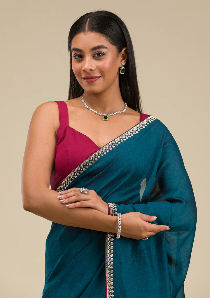 Ignite your wardrobe with Wearfella Trends teal soft raw silk saree, a masterpiece twinkling with golden stonework embroidery! This enchanting saree boasts luxurious fabric that gracefully wraps around you, ensuring every sway catches the light and eyes alike. Perfect for the woman who loves to express herself with a touch of tradition and a splash of sparkle!.