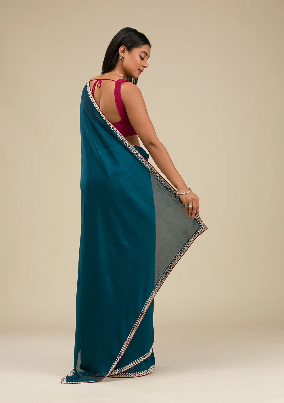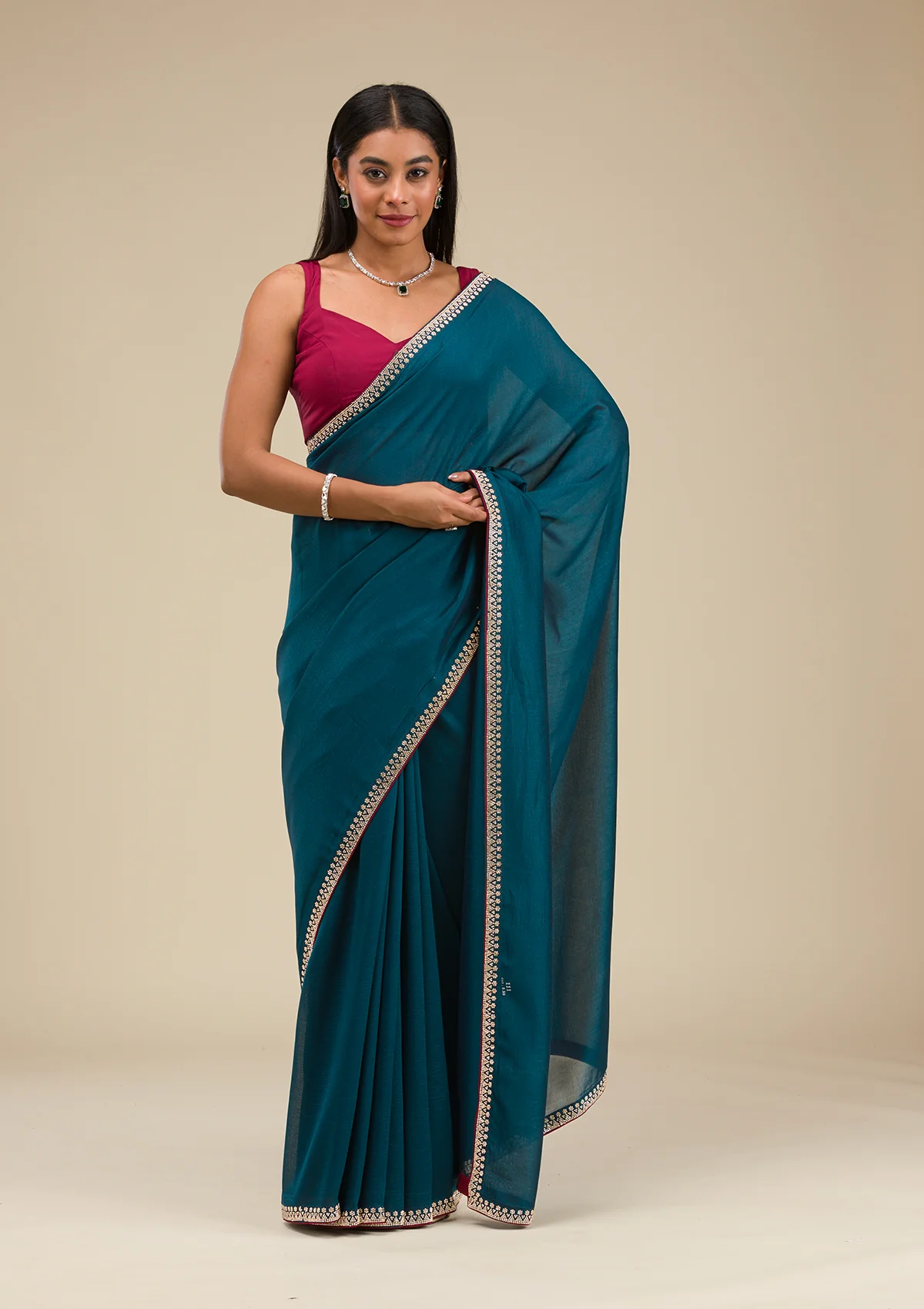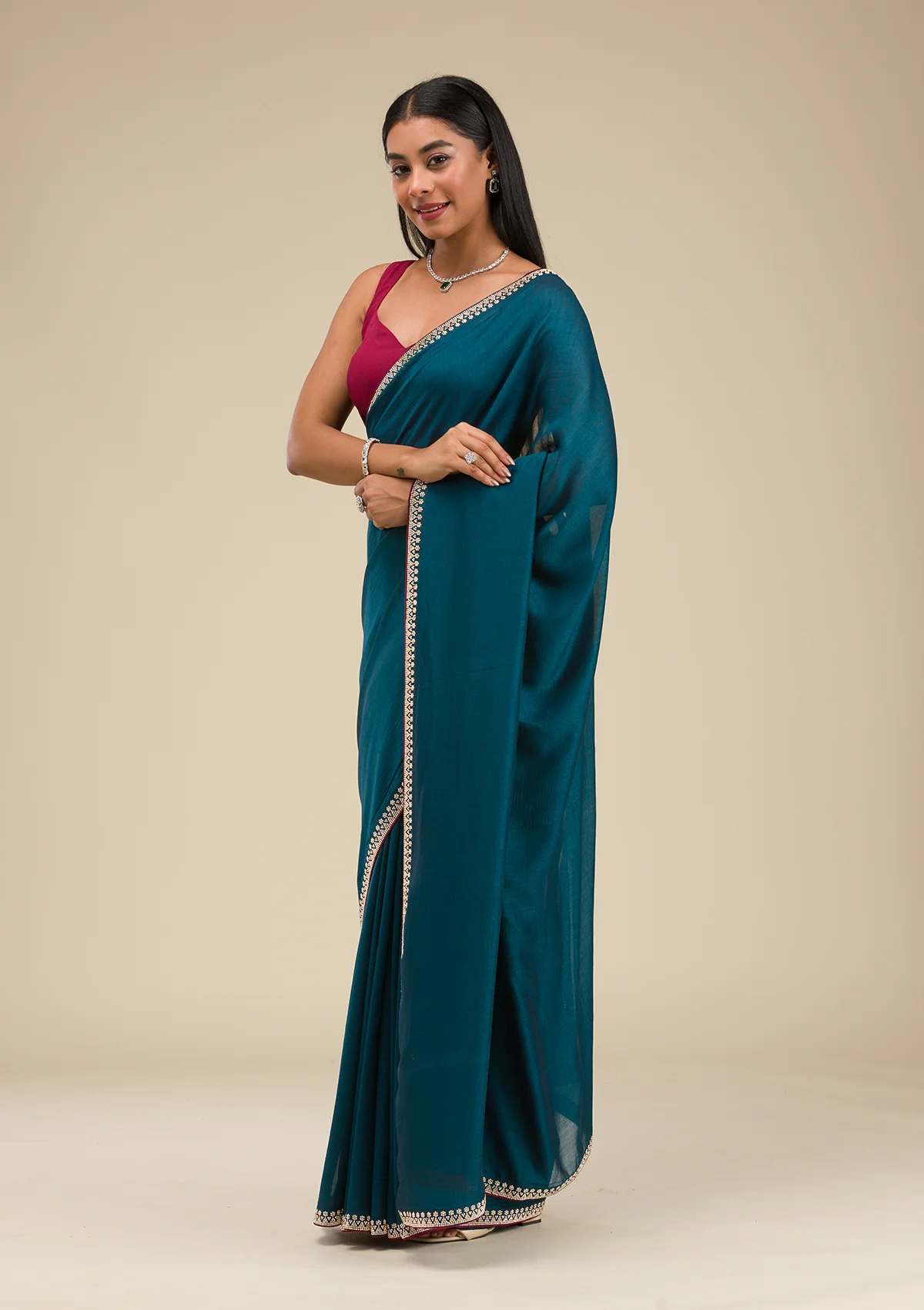 Ignite your wardrobe with Wearfella Trends teal soft raw silk saree, a masterpiece twinkling with golden stonework embroidery! This enchanting saree boasts luxurious fabric that gracefully wraps around you, ensuring every sway catches the light and eyes alike. Perfect for the woman who loves to express herself with a touch of tradition and a splash of sparkle!.
