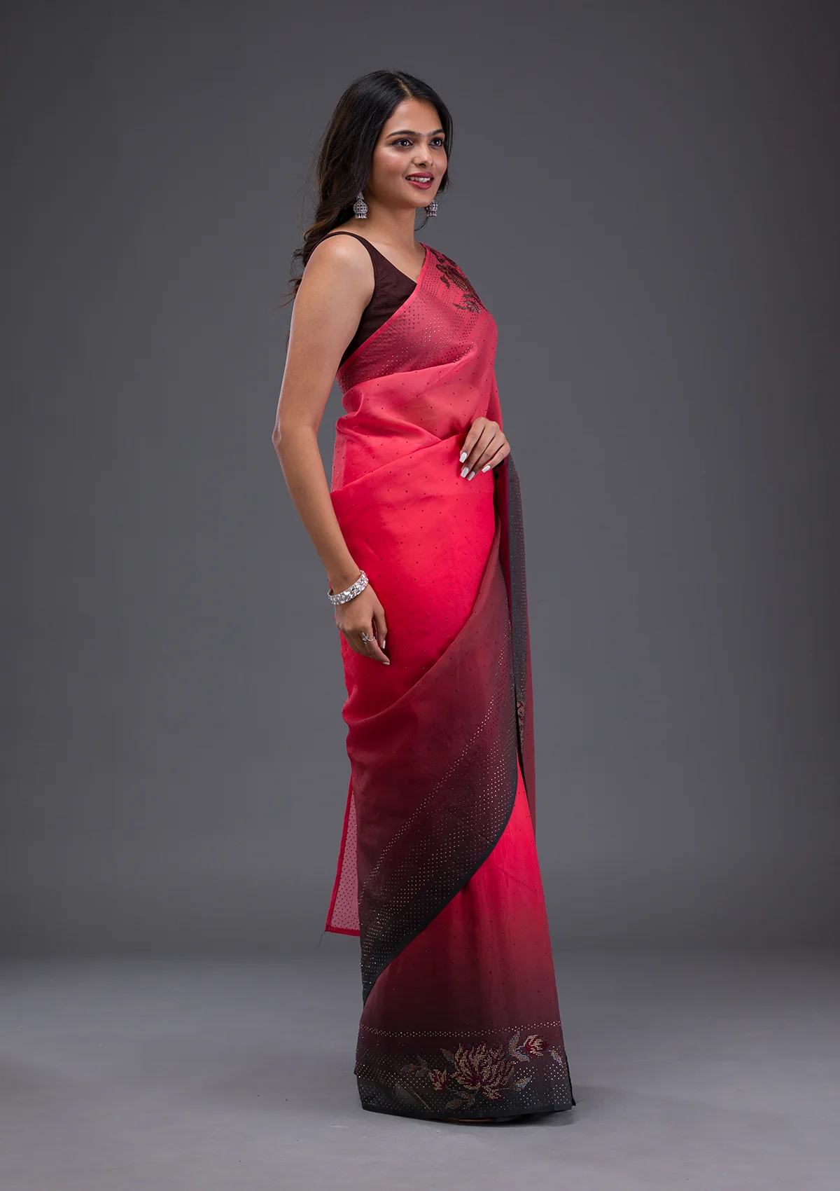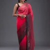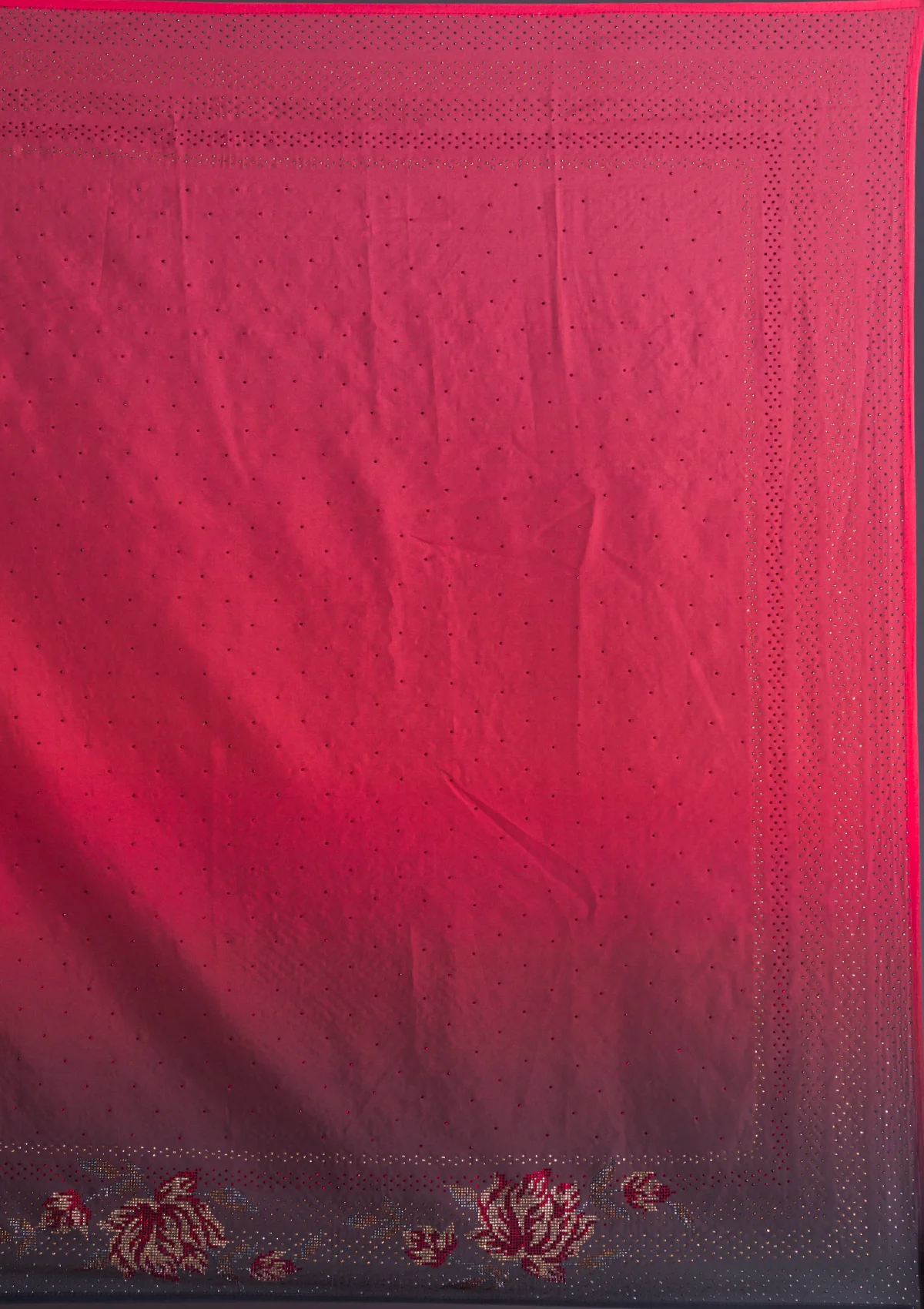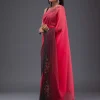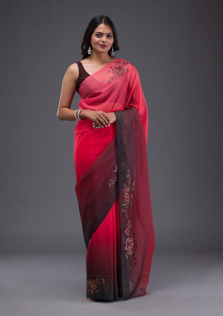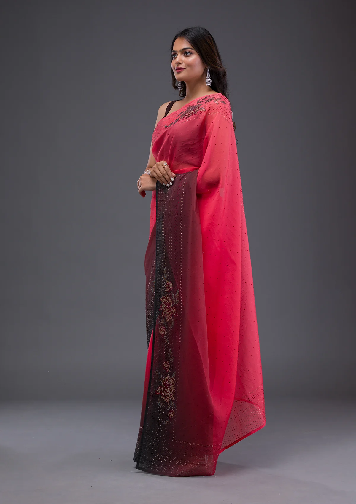 Peach Saree in Satin fabric. The Saree is elevated with Swarovski embroidery. It comes with an Unstitched blouse. Comes with the Wearfella Trends promise of premium quality.