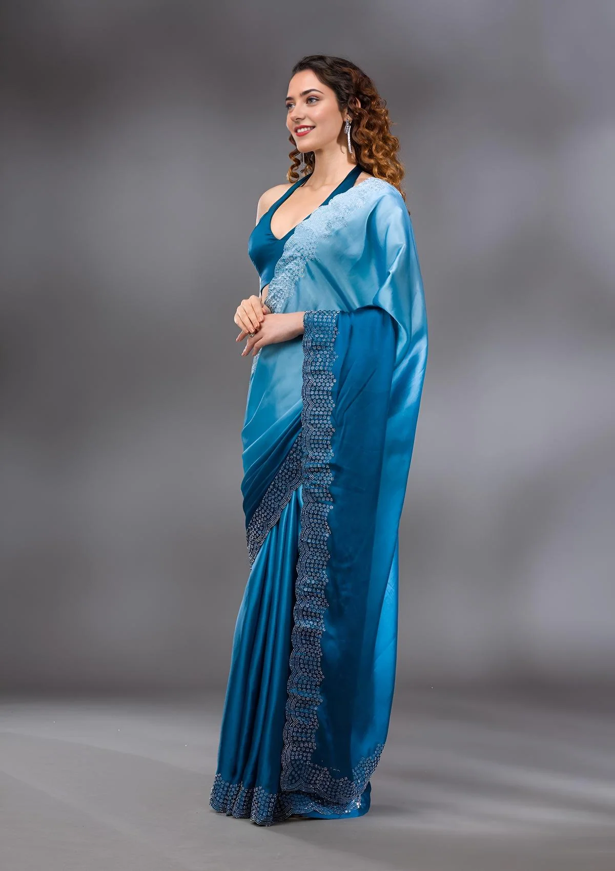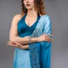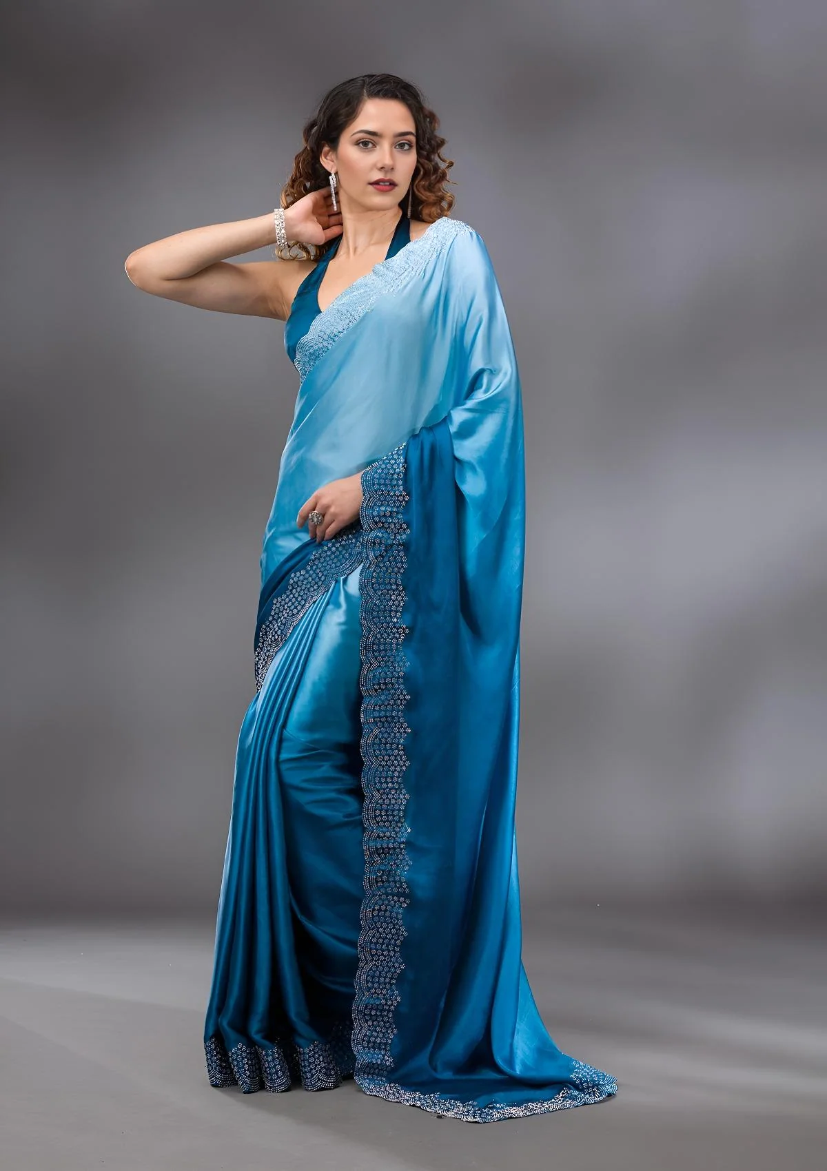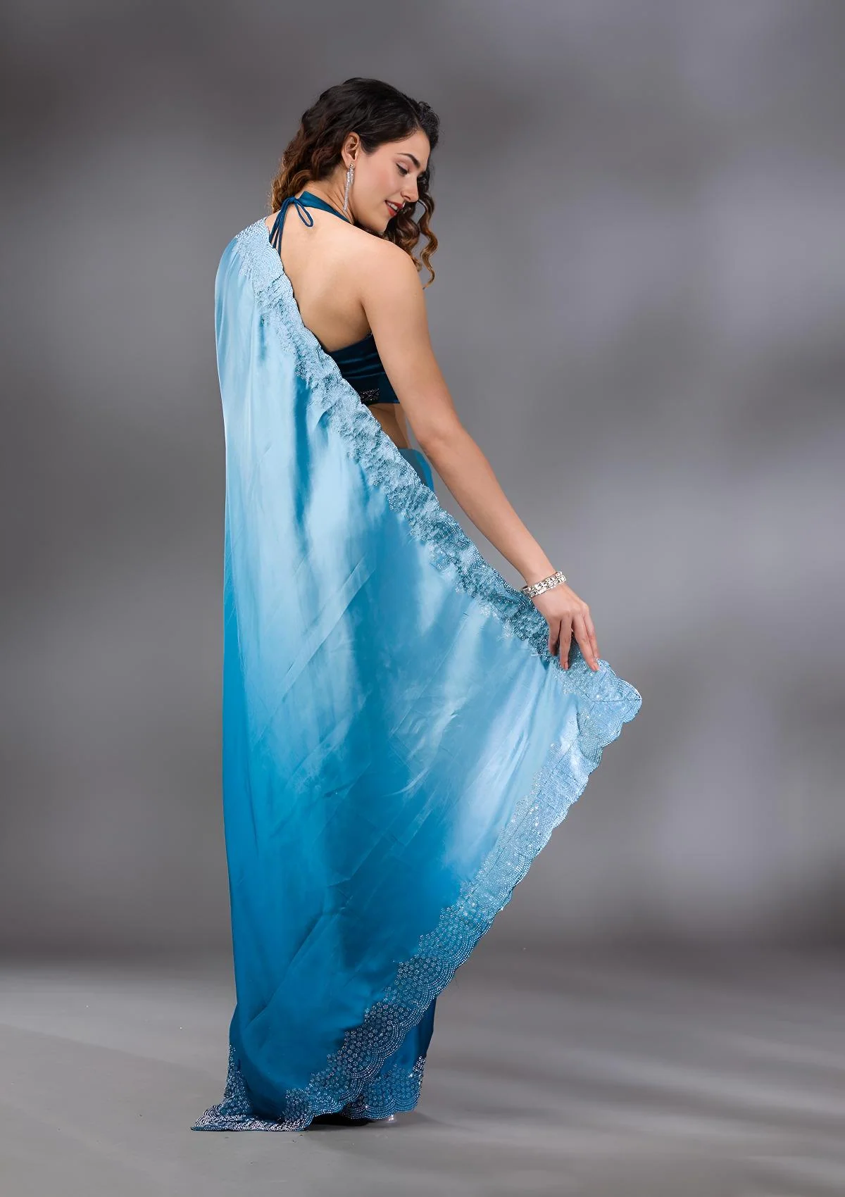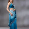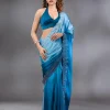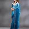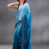 Peacock Blue Saree in Satin fabric. The Saree is elevated with Swarovski embroidery. It comes with an Unstitched blouse. Comes with the Wearfella Trends promise of premium quality.