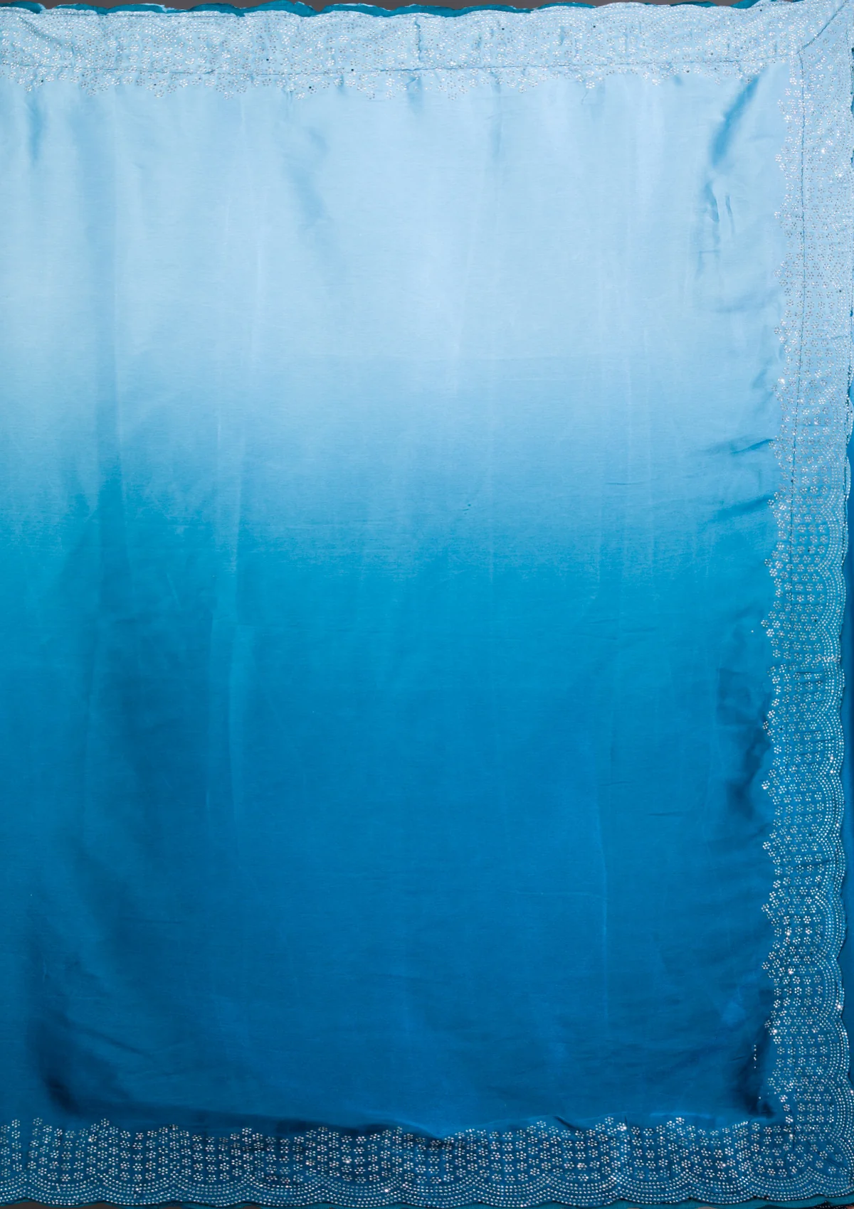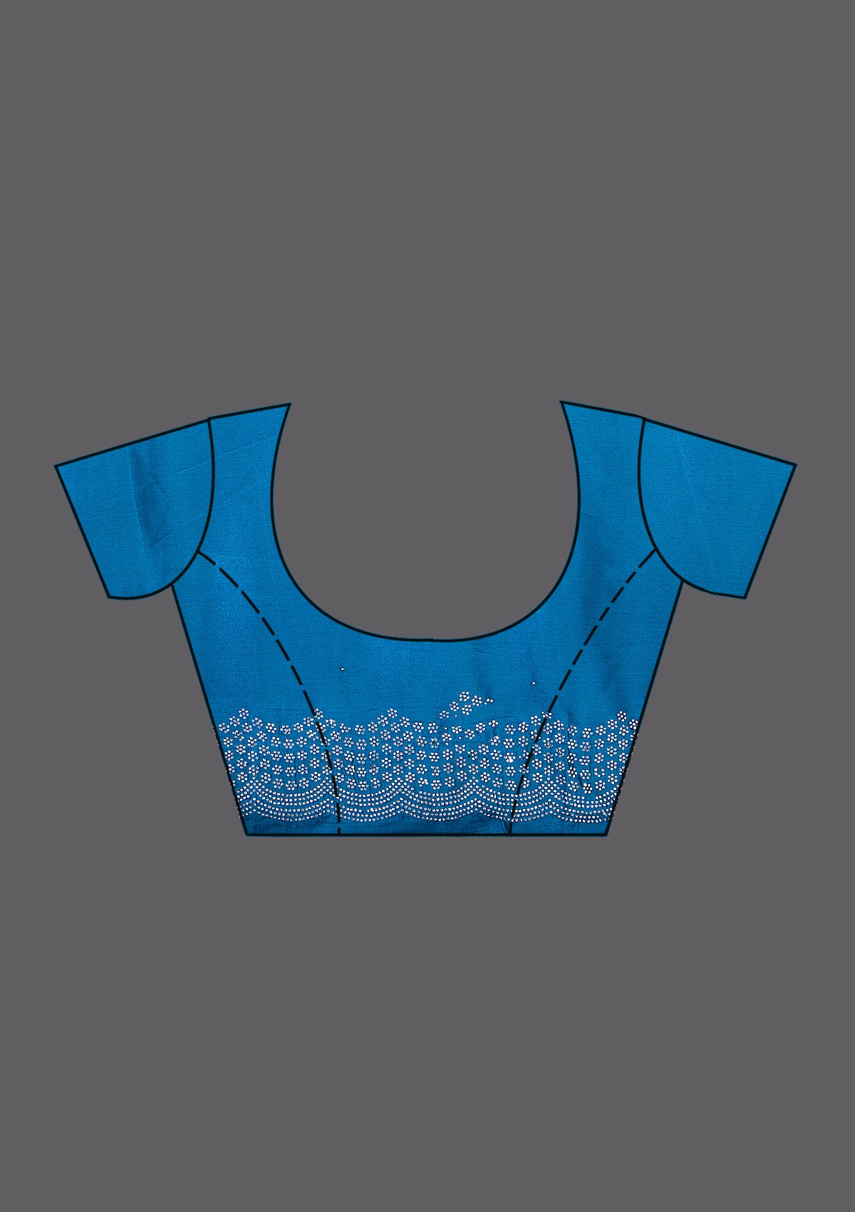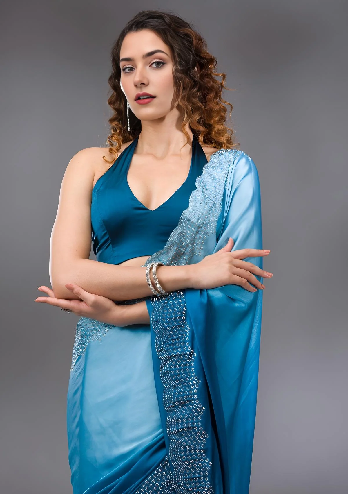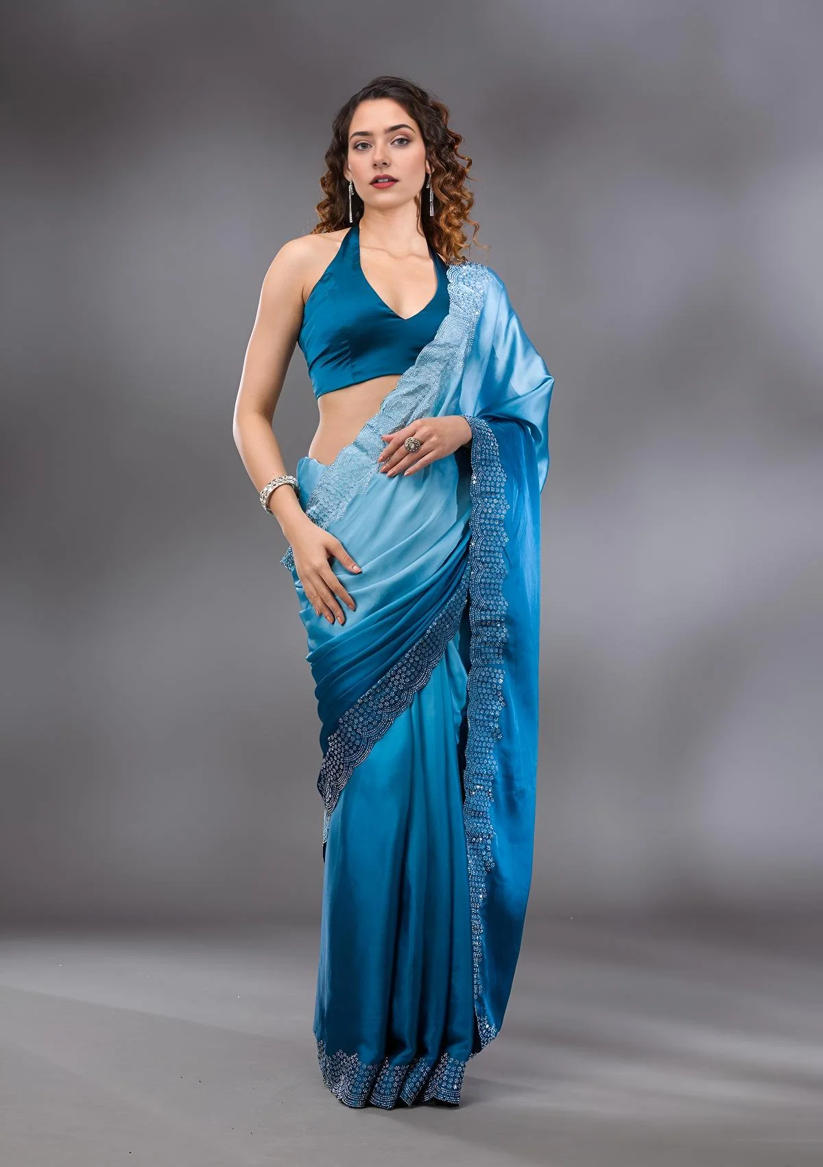 Peacock Blue Saree in Satin fabric. The Saree is elevated with Swarovski embroidery. It comes with an Unstitched blouse. Comes with the Wearfella Trends promise of premium quality.