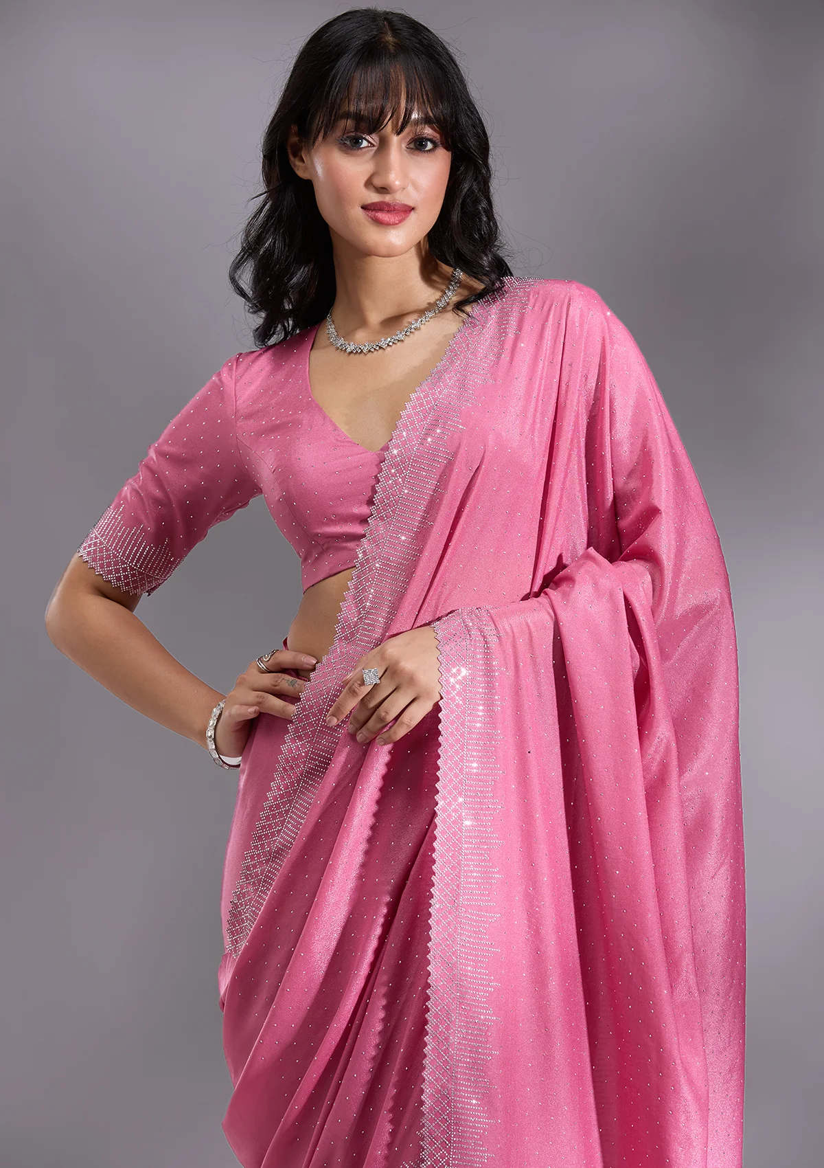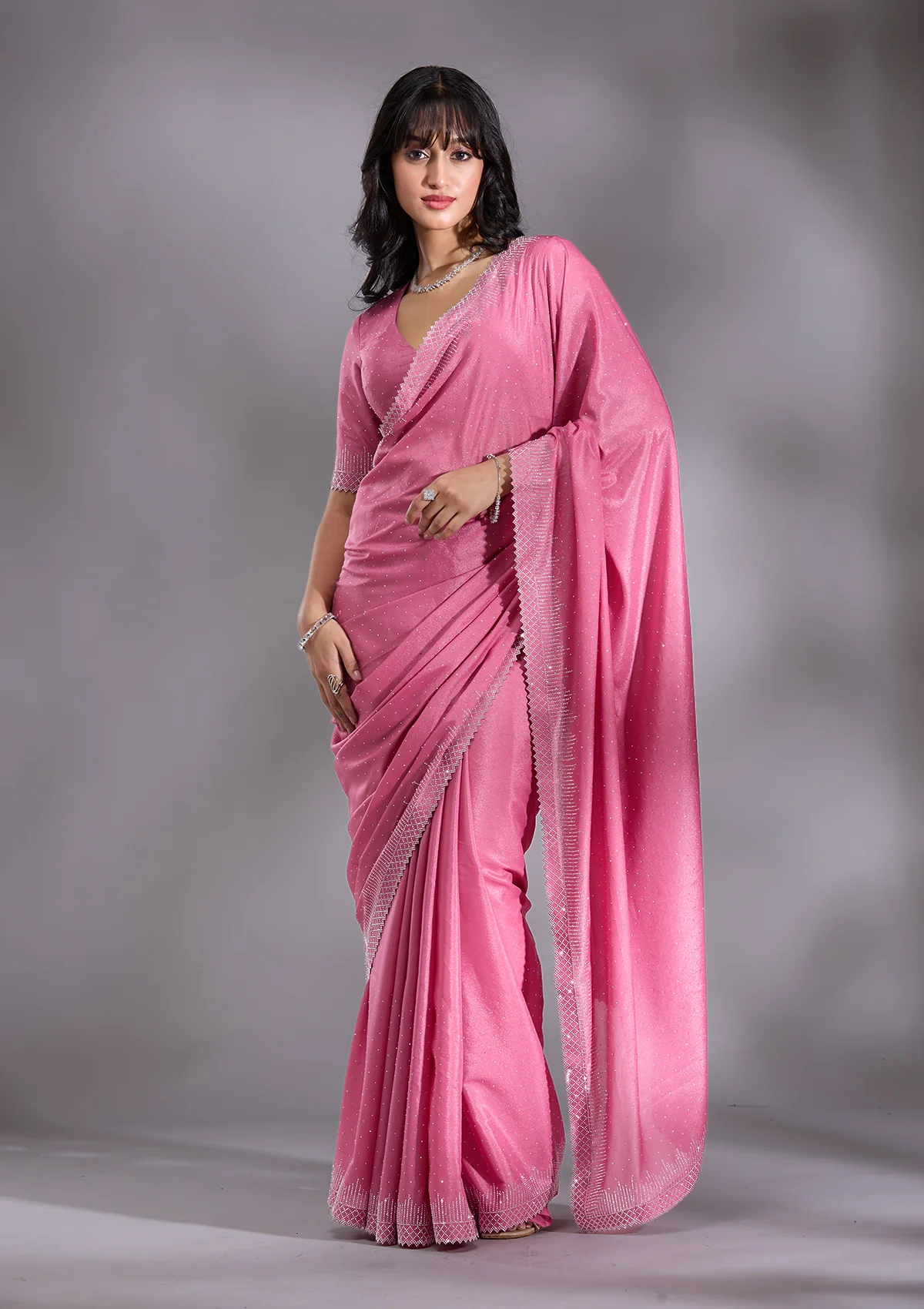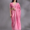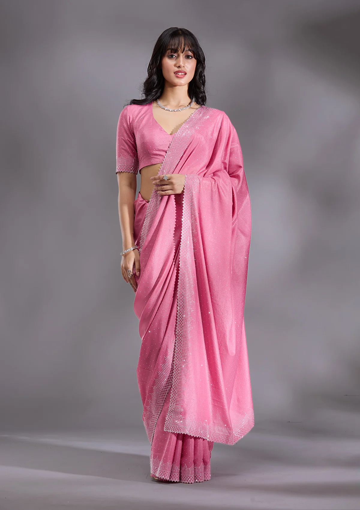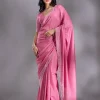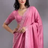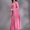 Pink Saree in Satin fabric. The Saree is elevated with Stonework (Silver) embroidery. It comes with an Unstitched blouse. Comes with the Wearfella Trends promise of premium quality.