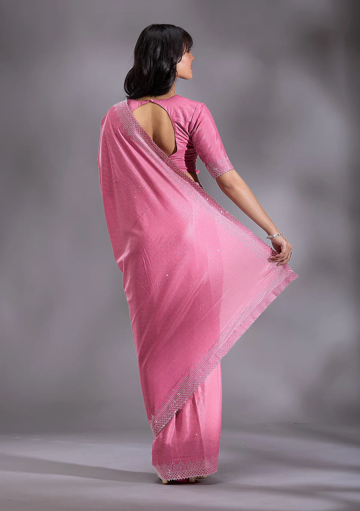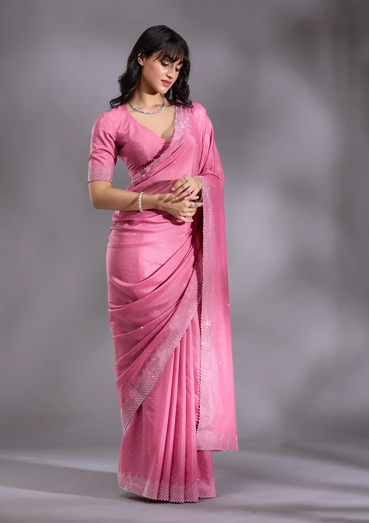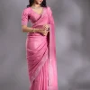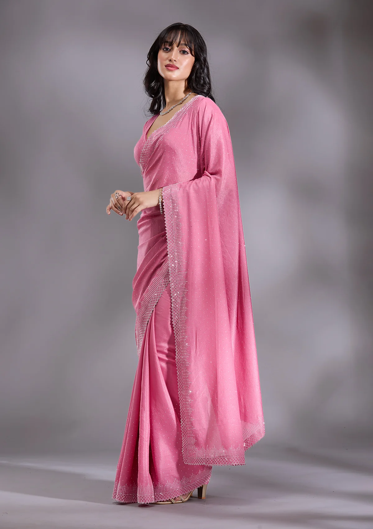 Pink Saree in Satin fabric. The Saree is elevated with Stonework (Silver) embroidery. It comes with an Unstitched blouse. Comes with the Wearfella Trends promise of premium quality.