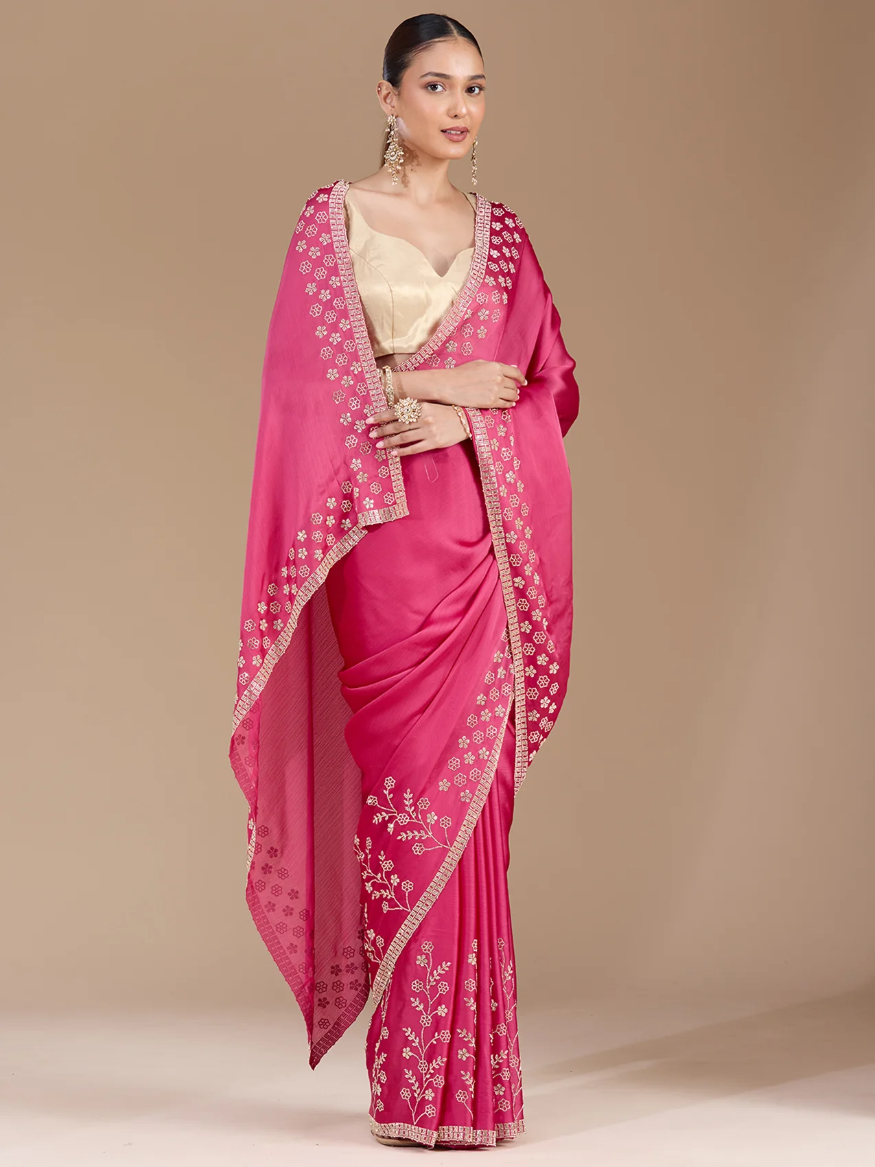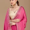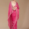 Pink Saree in Chiffon fabric. The Saree is elevated with Stonework (Gold) embroidery. It comes with an Unstitched blouse. Comes with the  promise of premium quality.