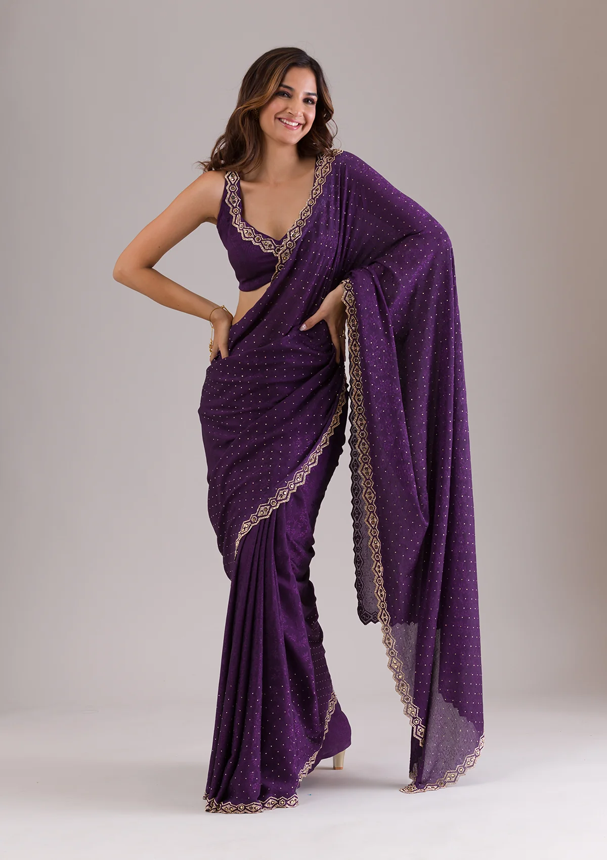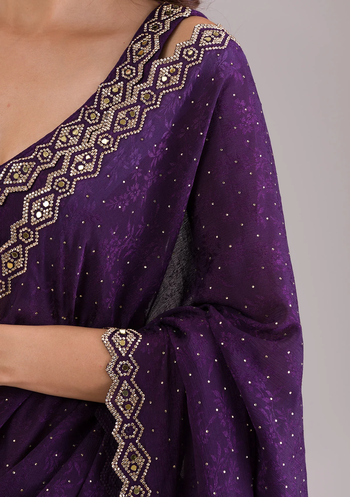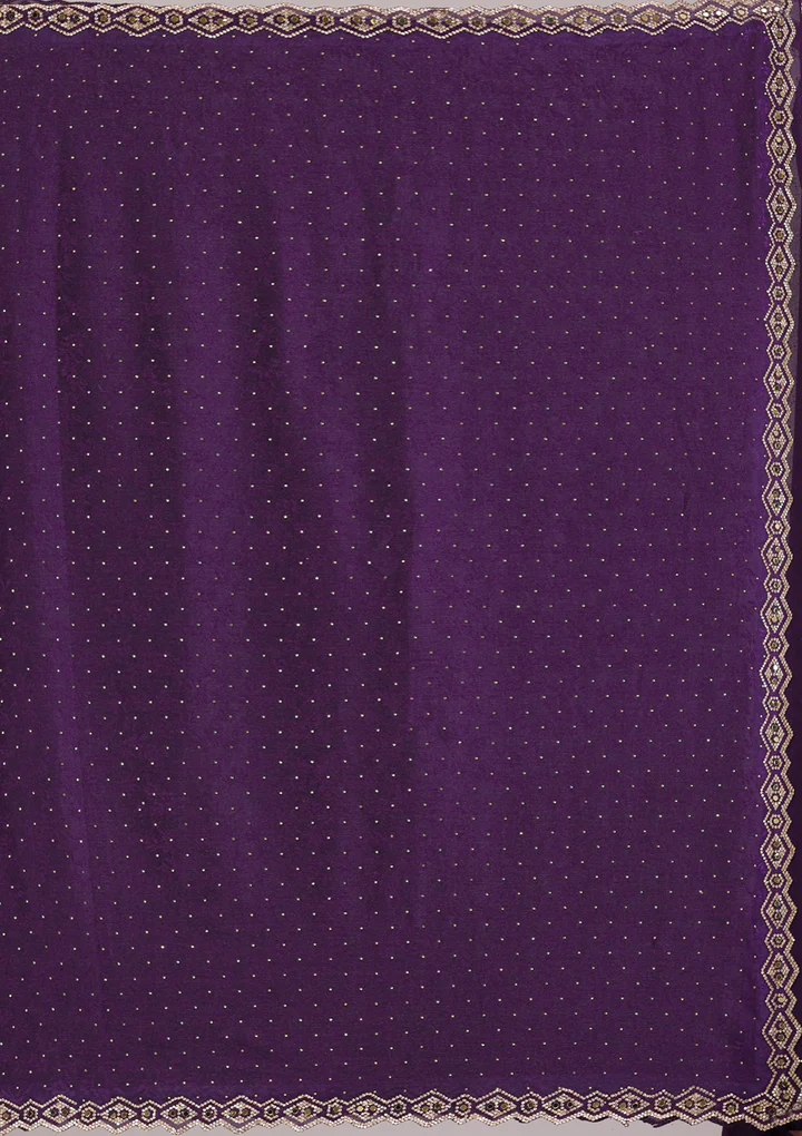 Dazzle and sparkle in every step with Wearfella Trends Semi Crepe Purple Saree, where traditional craftsmanship meets contemporary charm! Adorned with stunning mirrorwork embroidery.