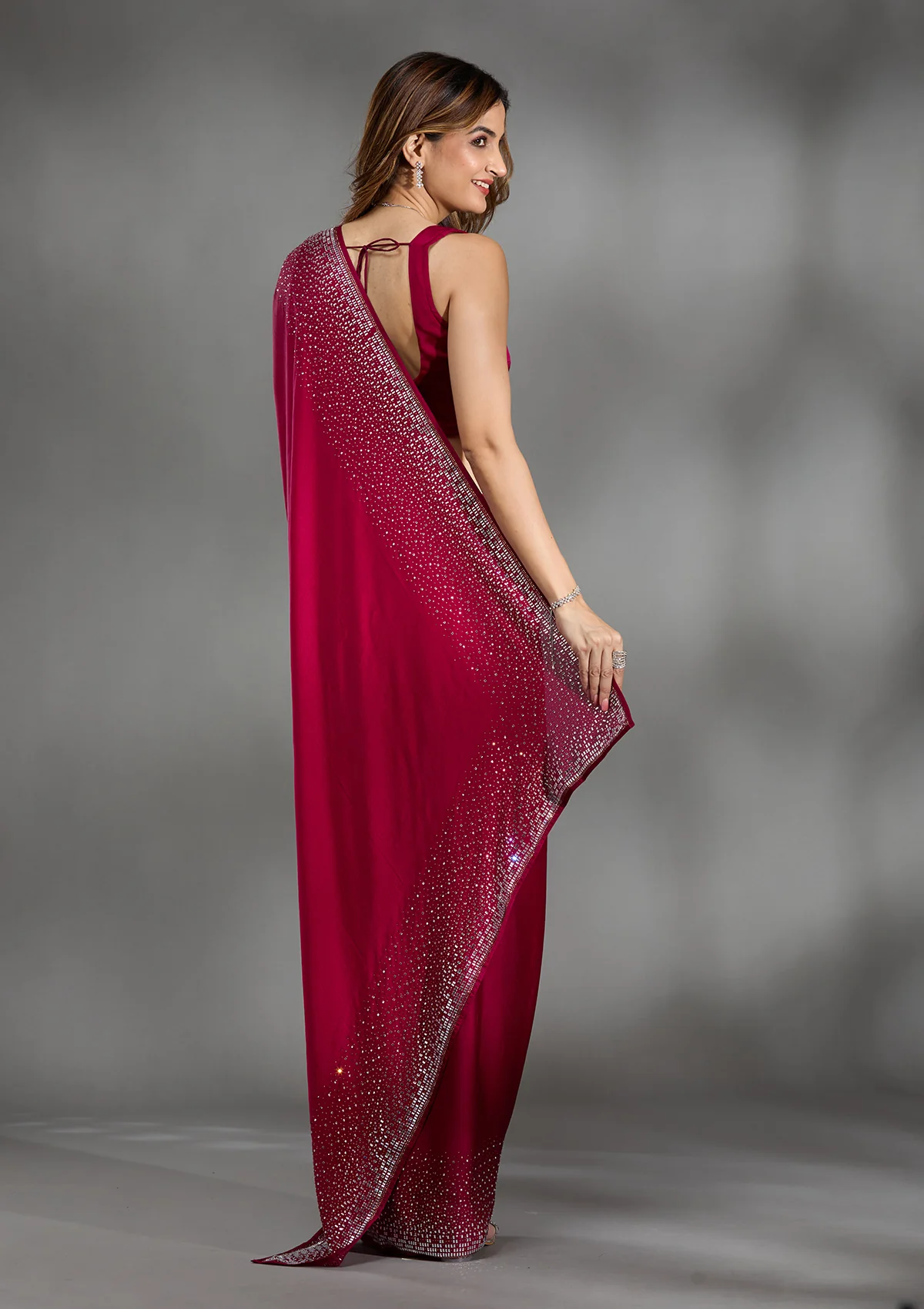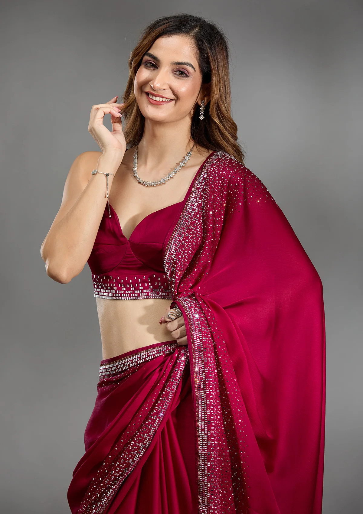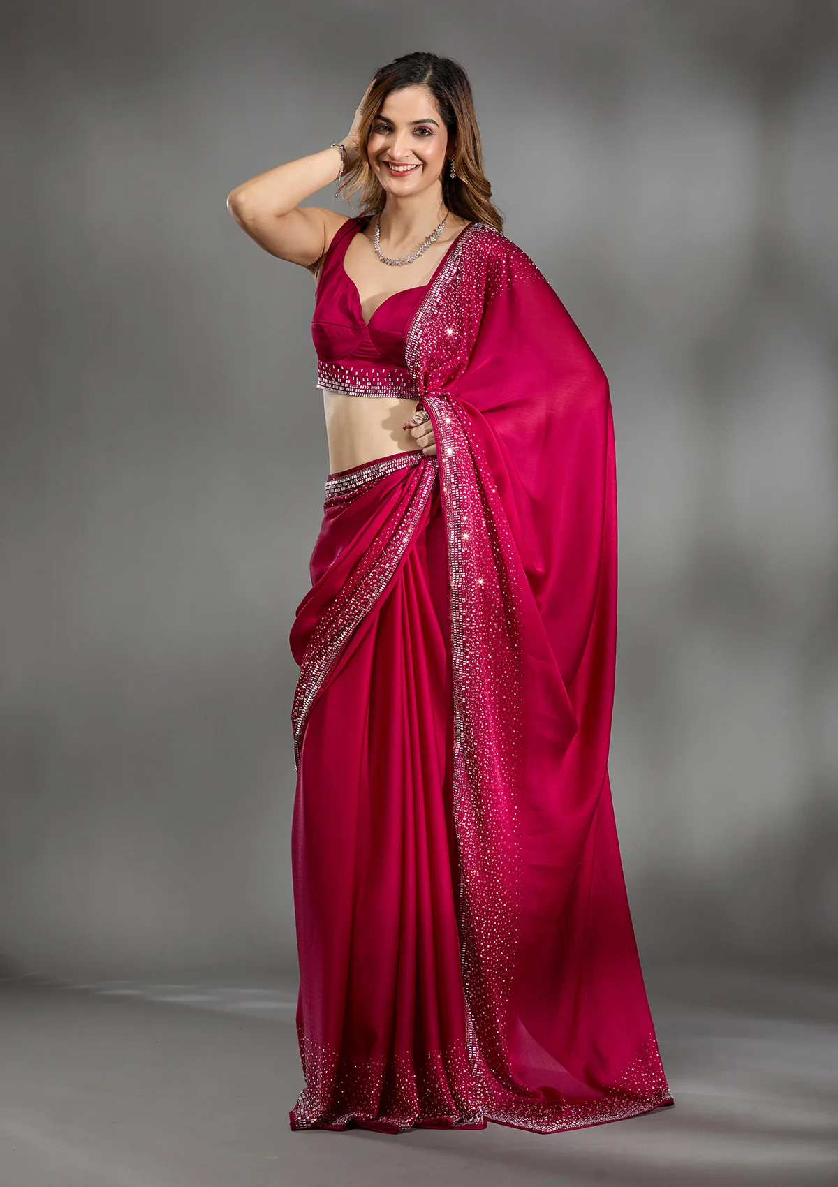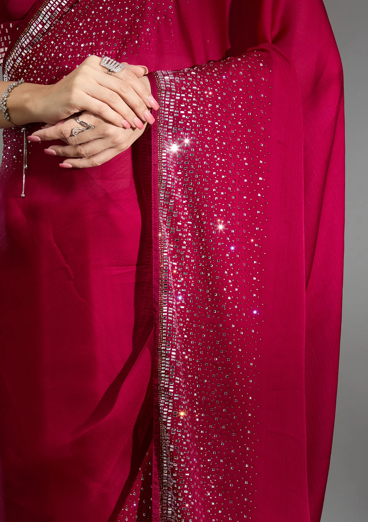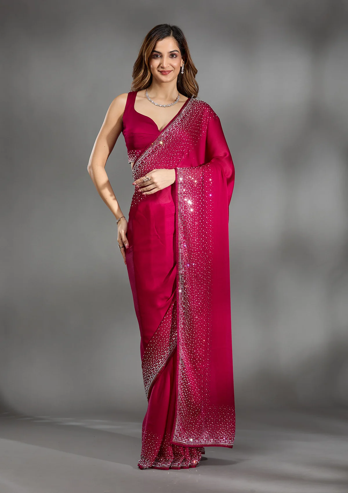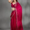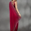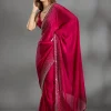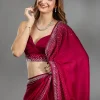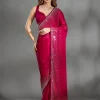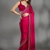 Rani Pink Saree in Chiffon fabric The Saree is elevated with Stonework embroidery It comes with an Unstitched blouse Comes with the Koskii promise of premium quality.