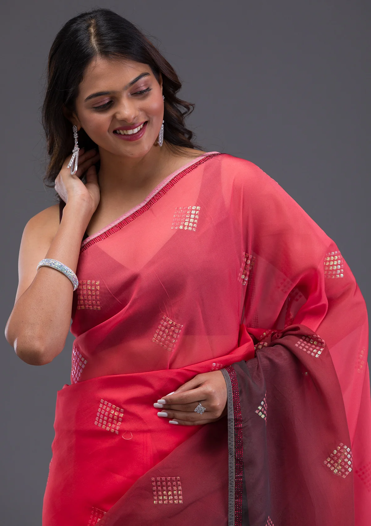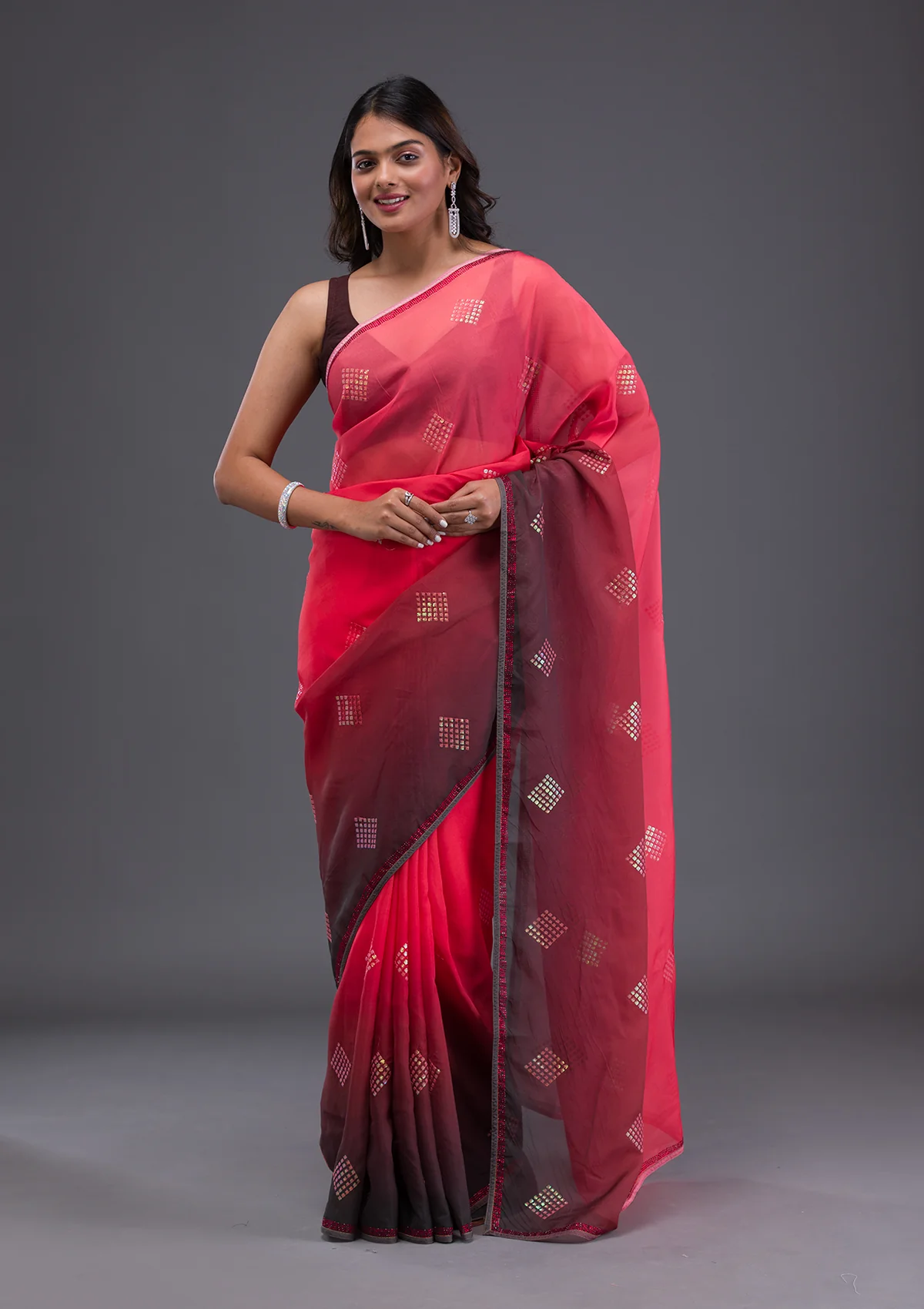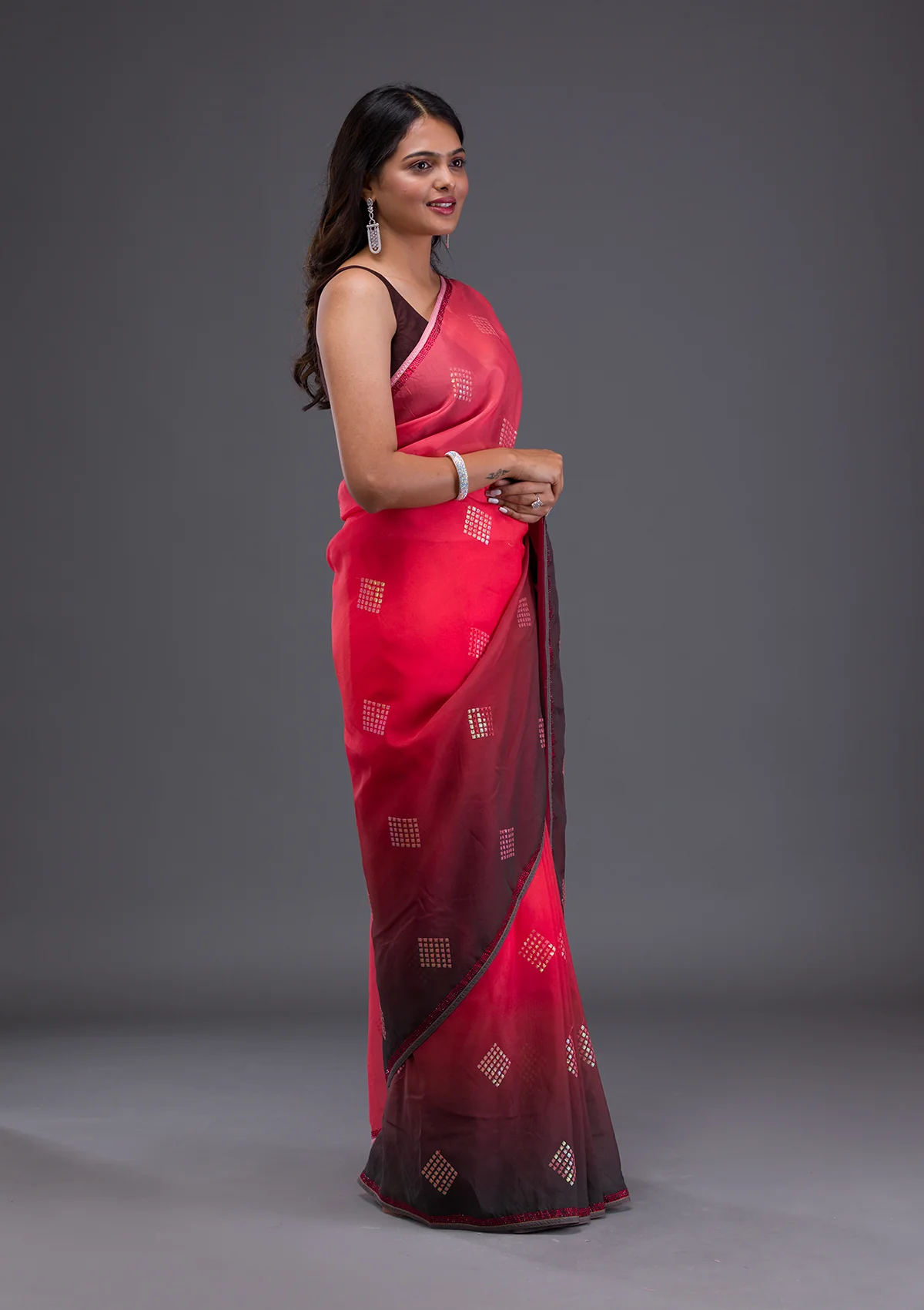 Red Saree in Satin fabric. The Saree is elevated with Swarovski embroidery. It comes with an Unstitched blouse. Comes with the Wearfella Trends promise of premium quality.