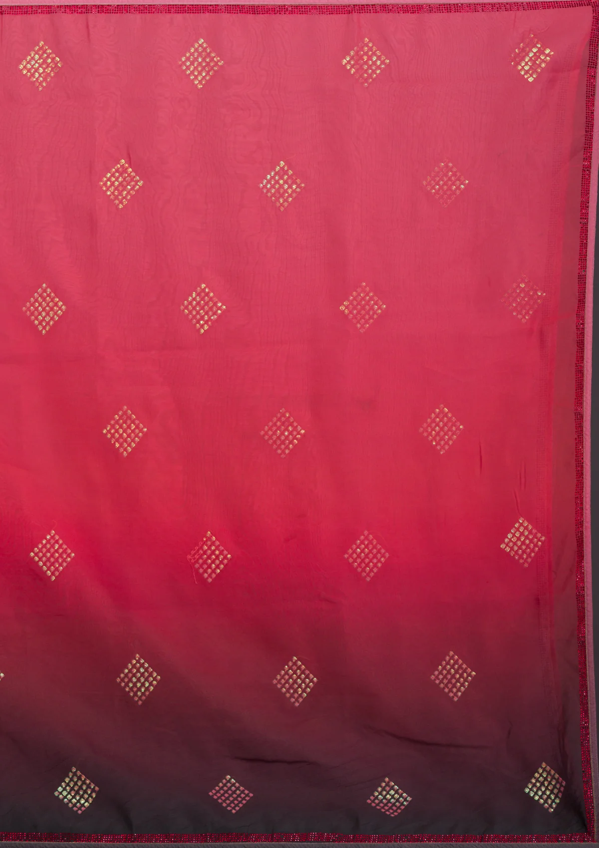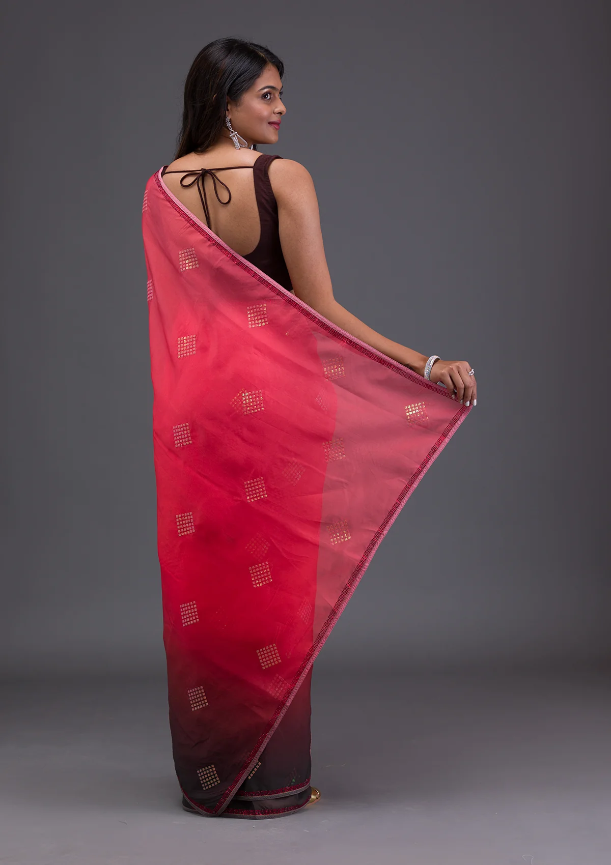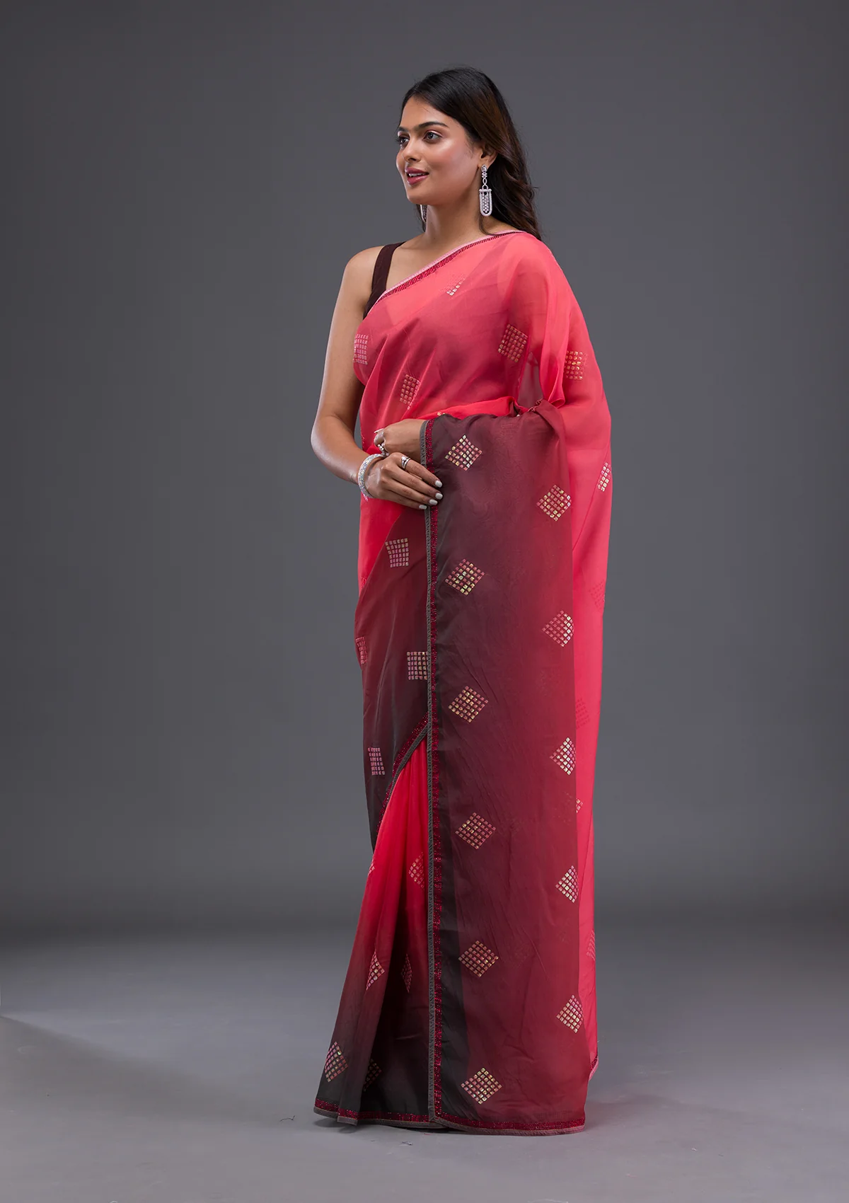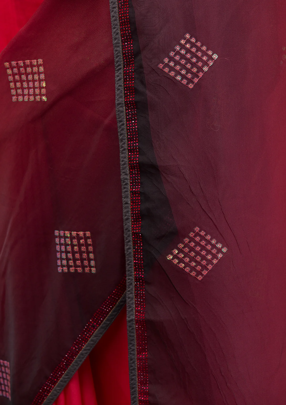 Red Saree in Satin fabric. The Saree is elevated with Swarovski embroidery. It comes with an Unstitched blouse. Comes with the Wearfella Trends promise of premium quality.