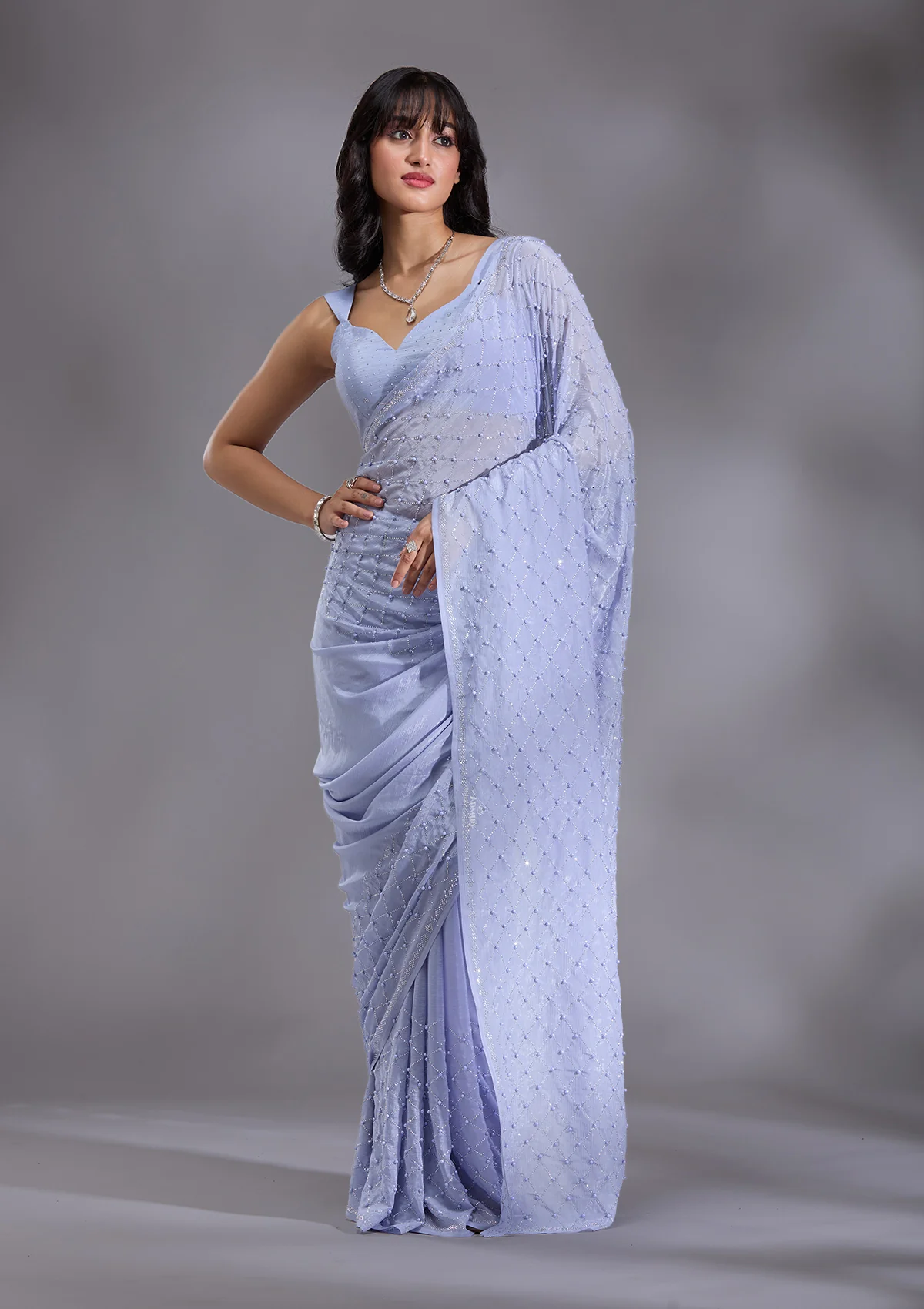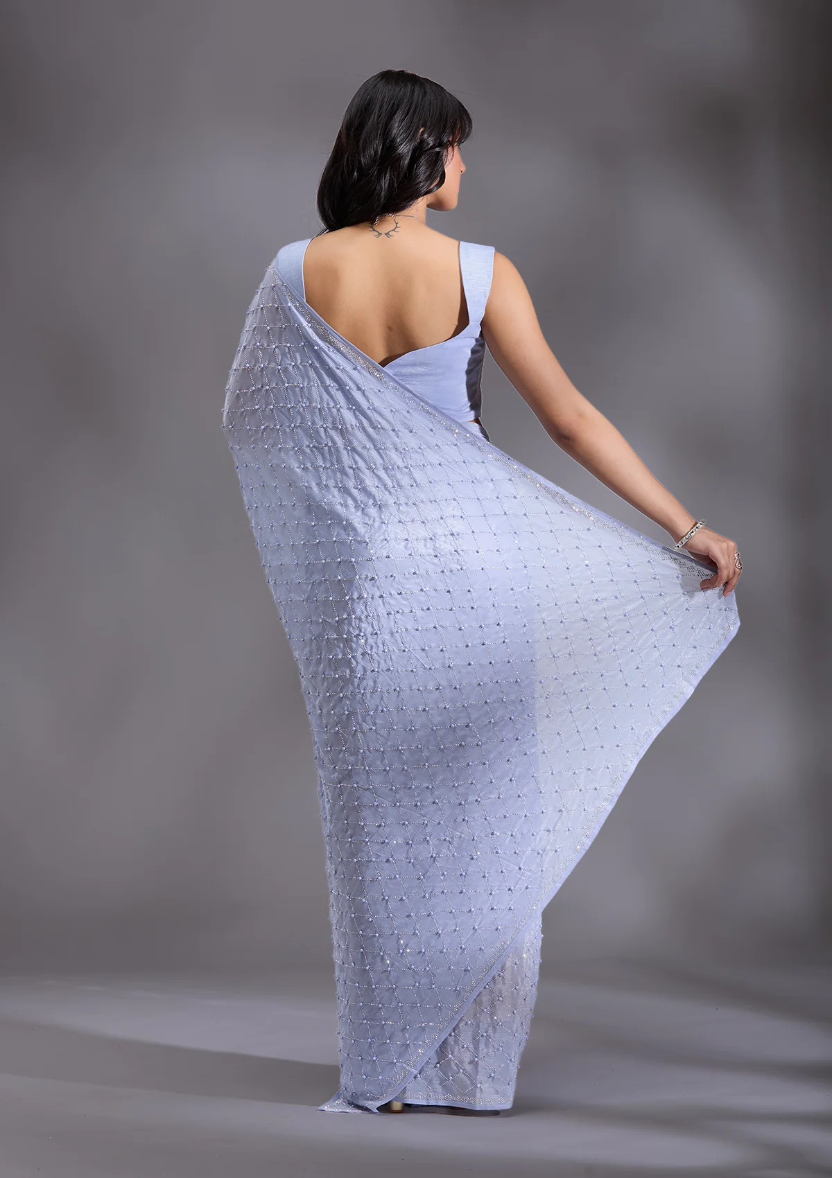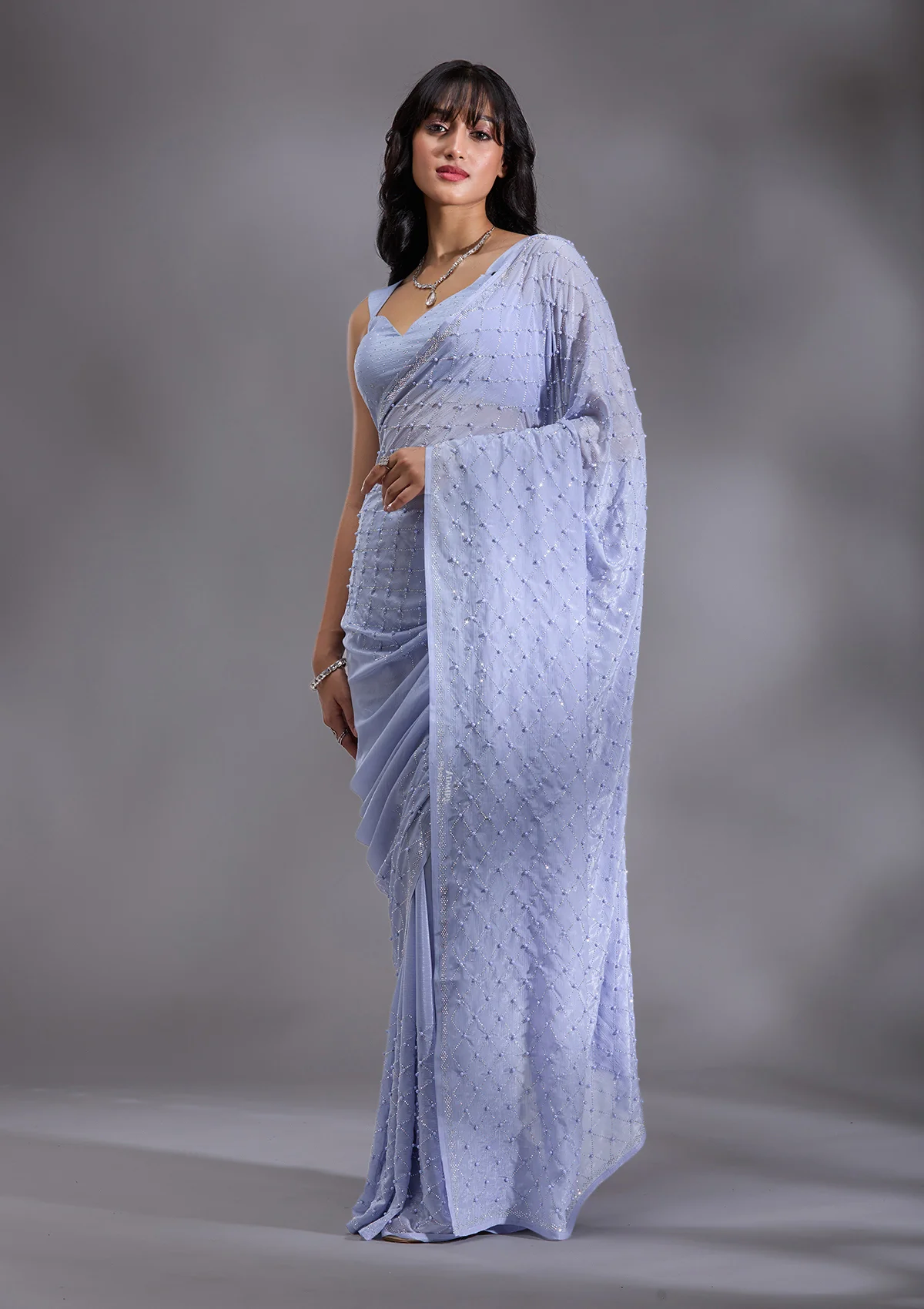 Sky Blue Saree in Chiffon fabric. The Saree is elevated with Pearlwork embroidery. It comes with an Unstitched blouse. Comes with the Wearfella Trends promise of premium quality.