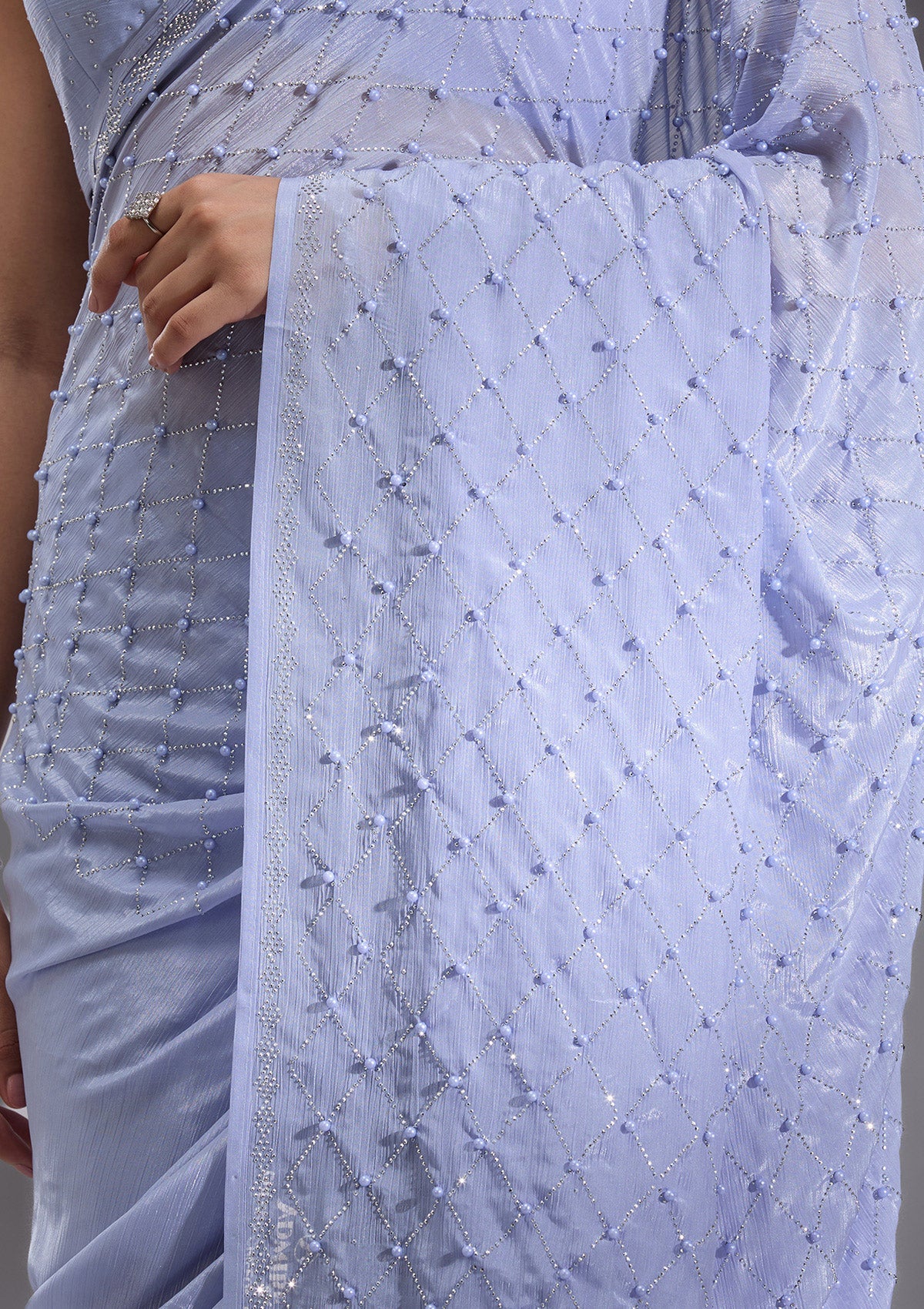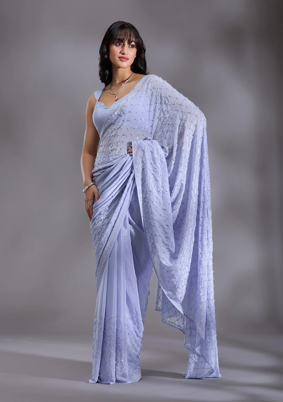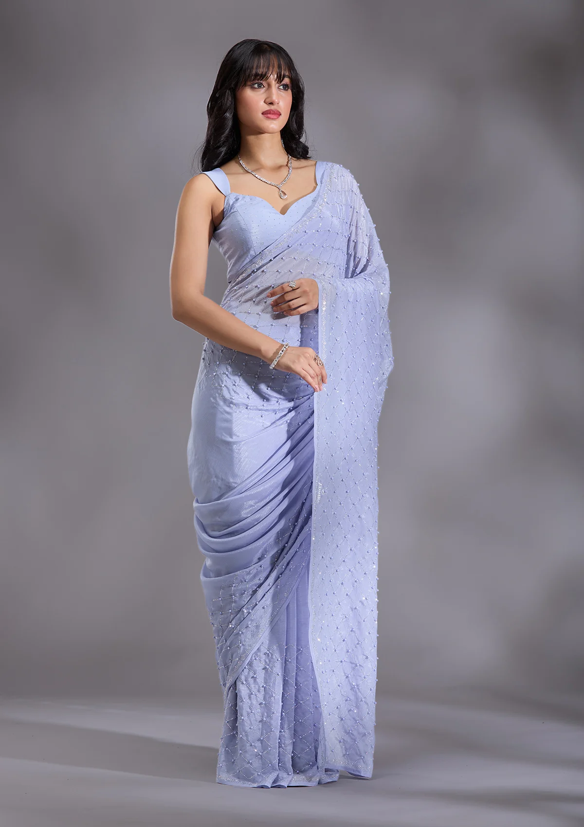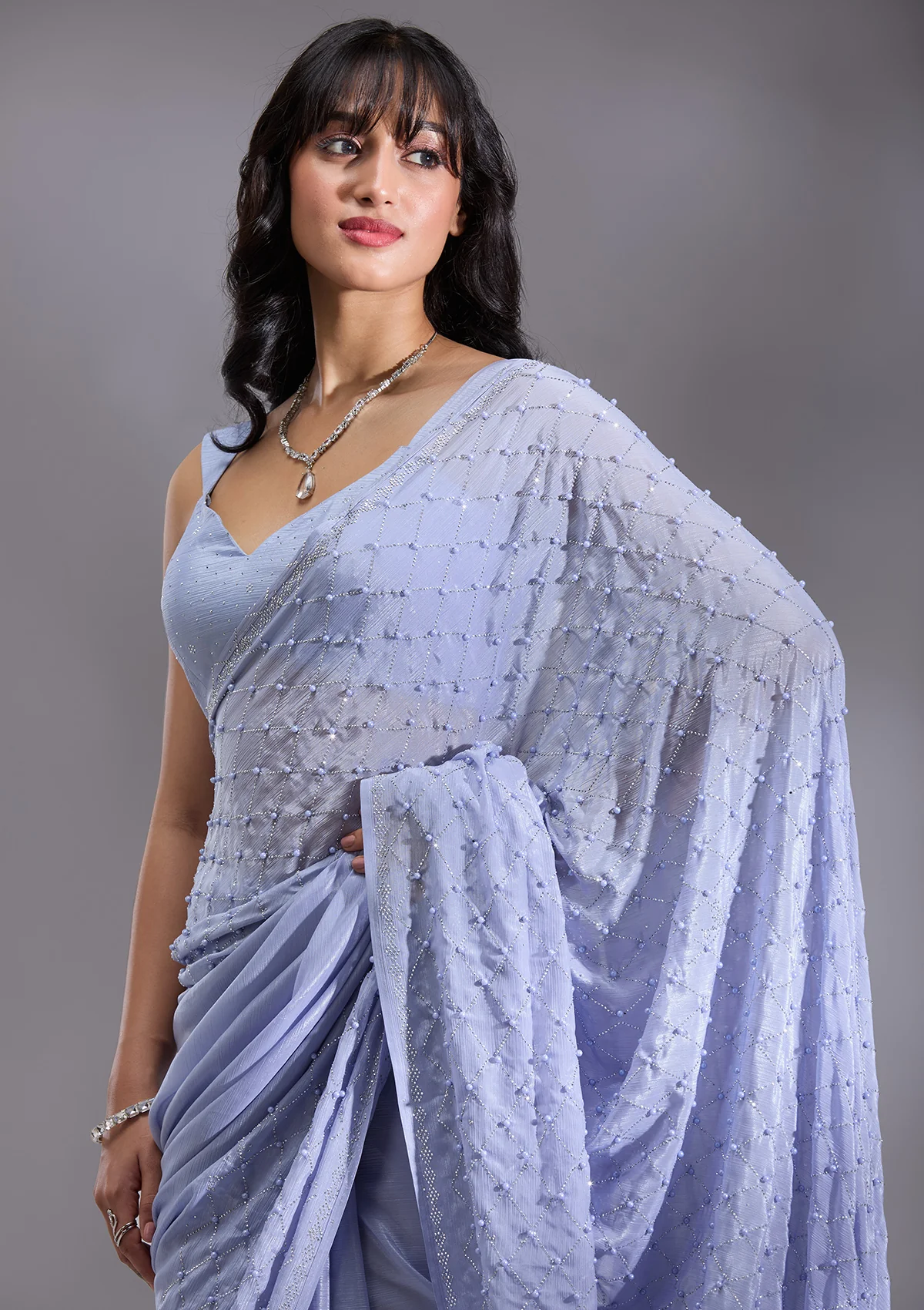 Sky Blue Saree in Chiffon fabric. The Saree is elevated with Pearlwork embroidery. It comes with an Unstitched blouse. Comes with the Wearfella Trends promise of premium quality.