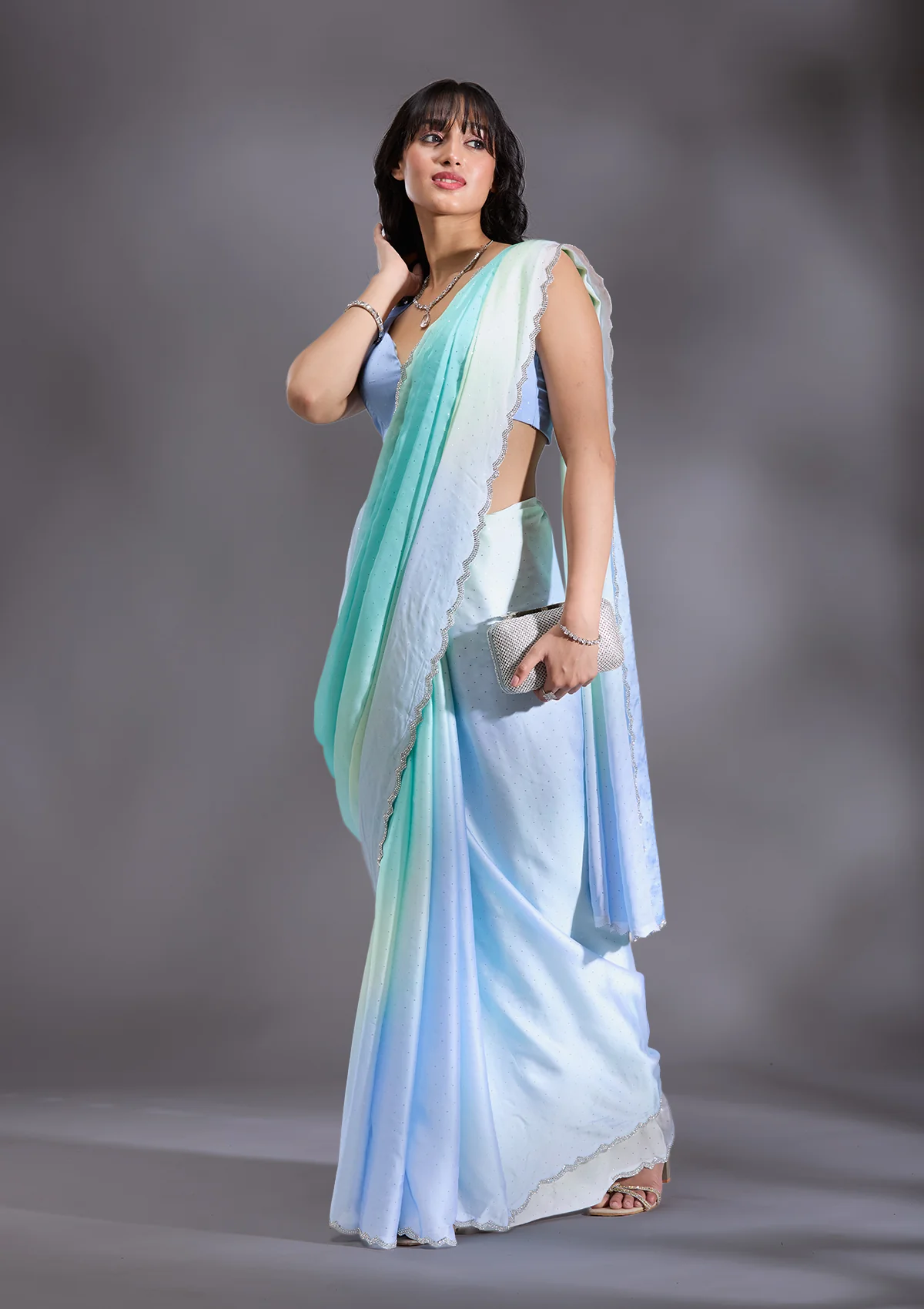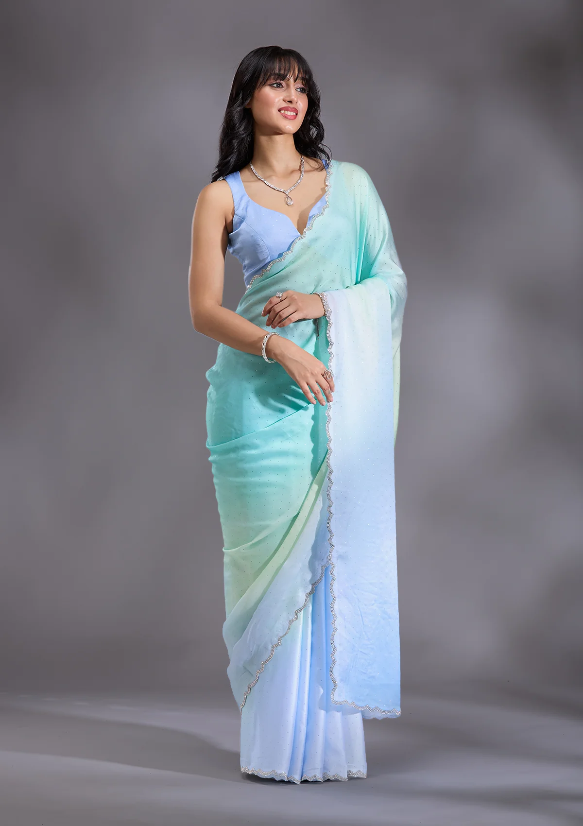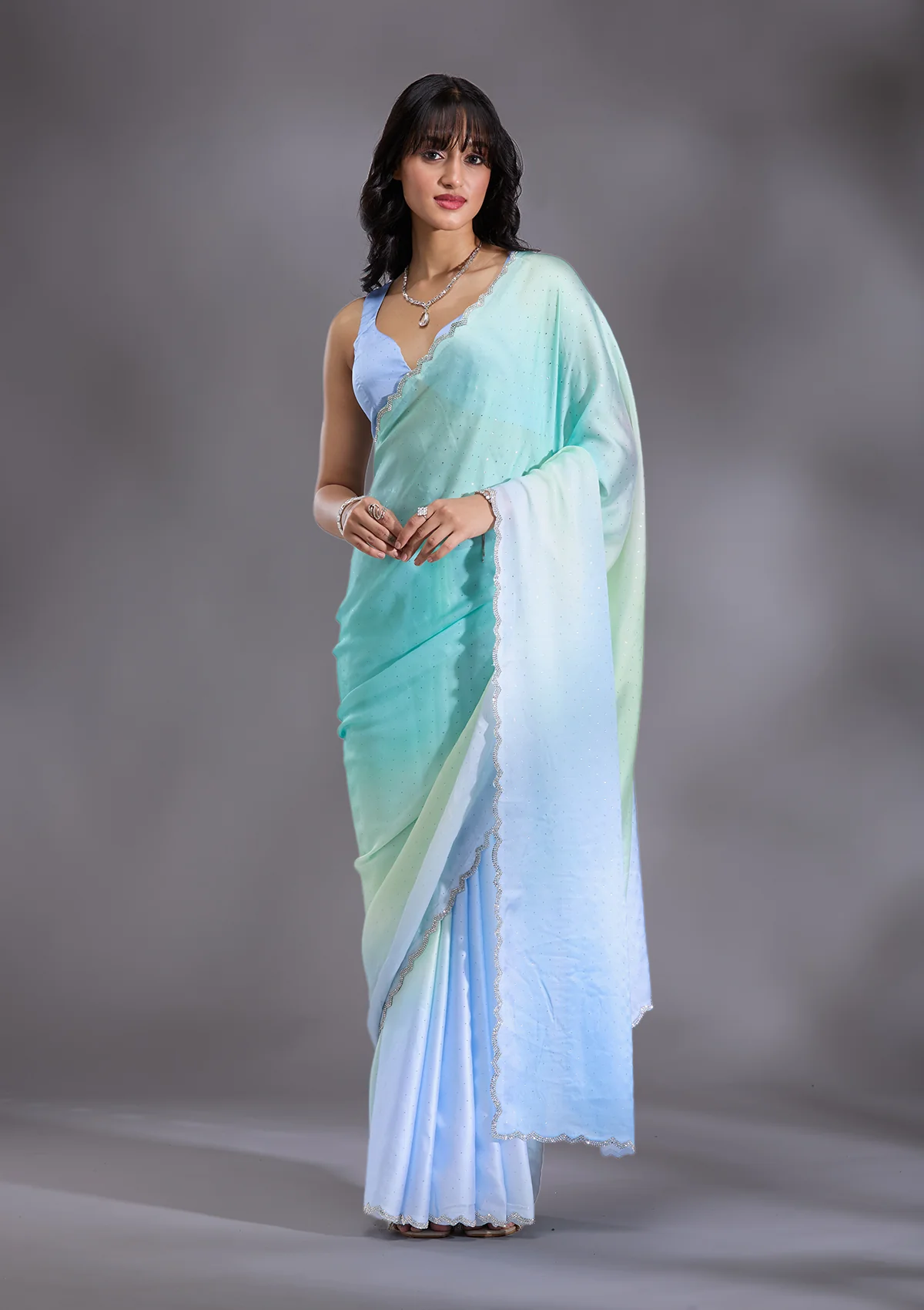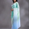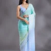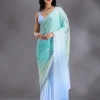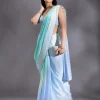 Sky Blue Saree in Satin fabric. The Saree is elevated with Stonework (Silver) embroidery. It comes with an Unstitched blouse. Comes with the Wearfella Trends promise of premium qualit.
