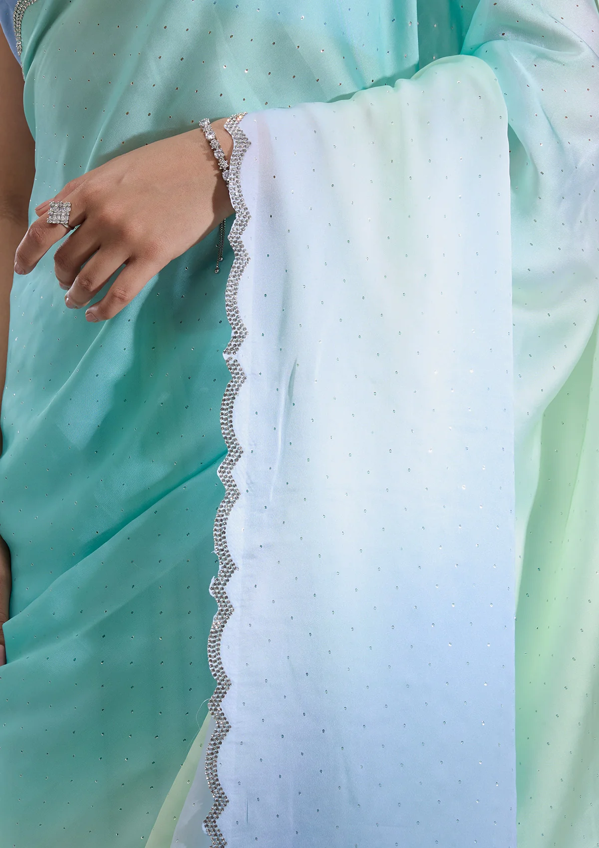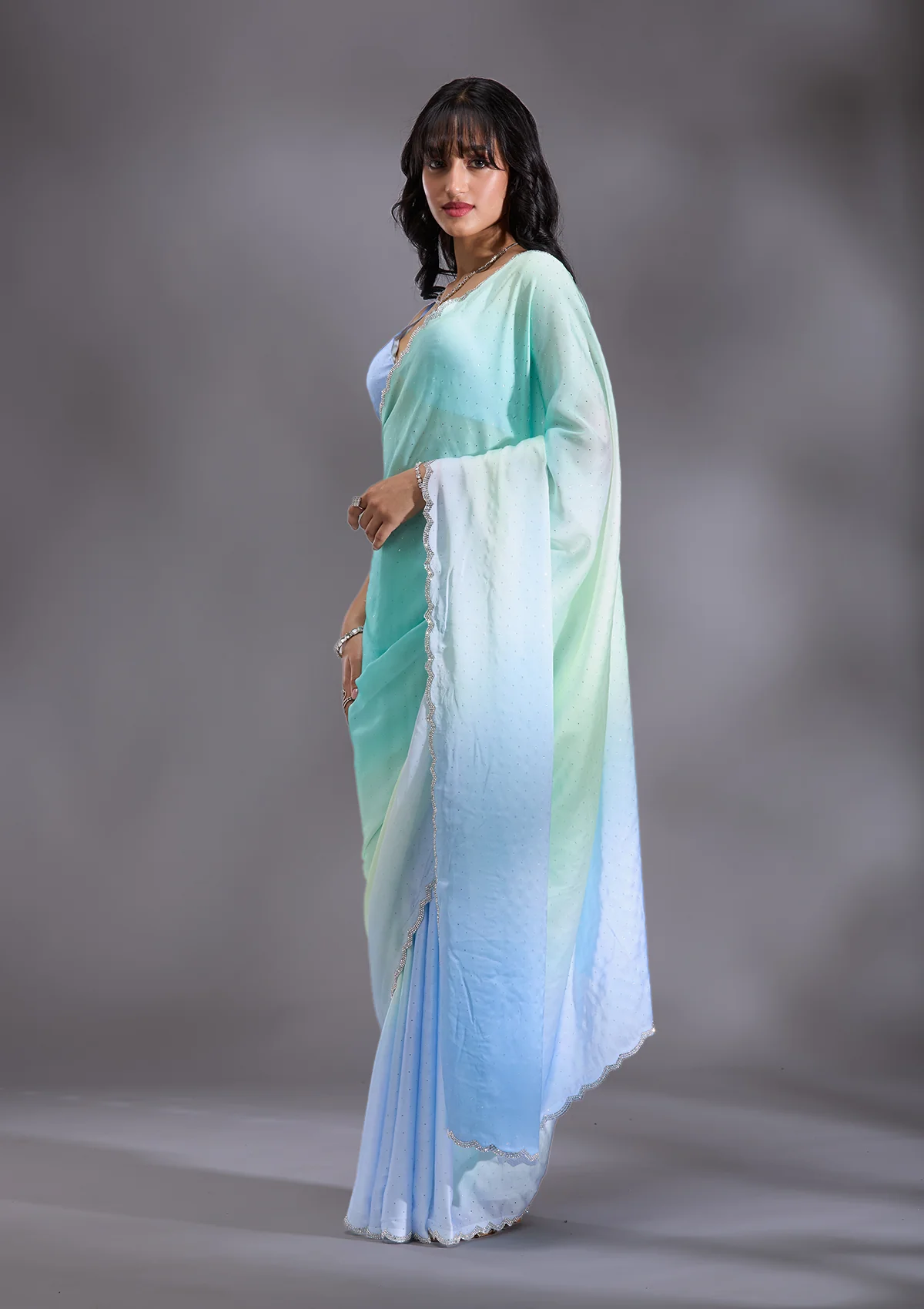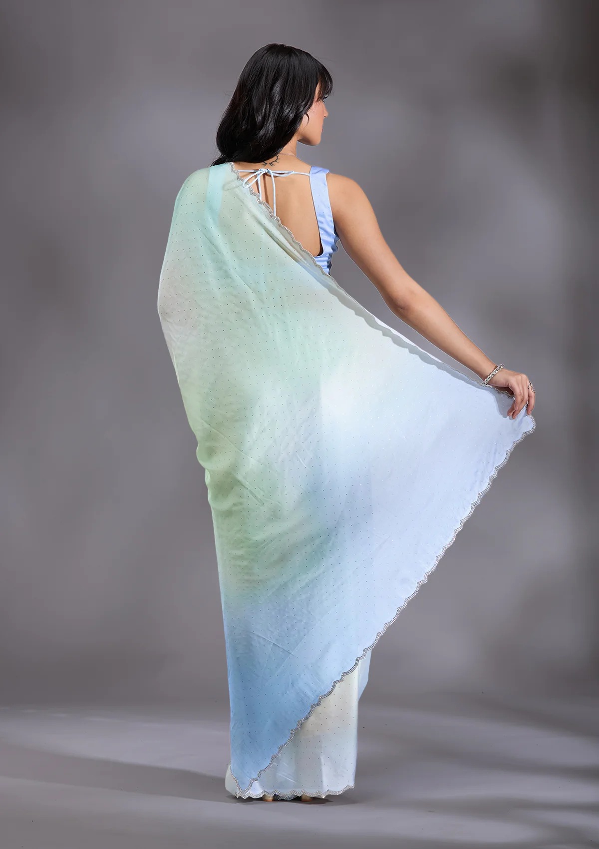 Sky Blue Saree in Satin fabric. The Saree is elevated with Stonework (Silver) embroidery. It comes with an Unstitched blouse. Comes with the Wearfella Trends promise of premium qualit.