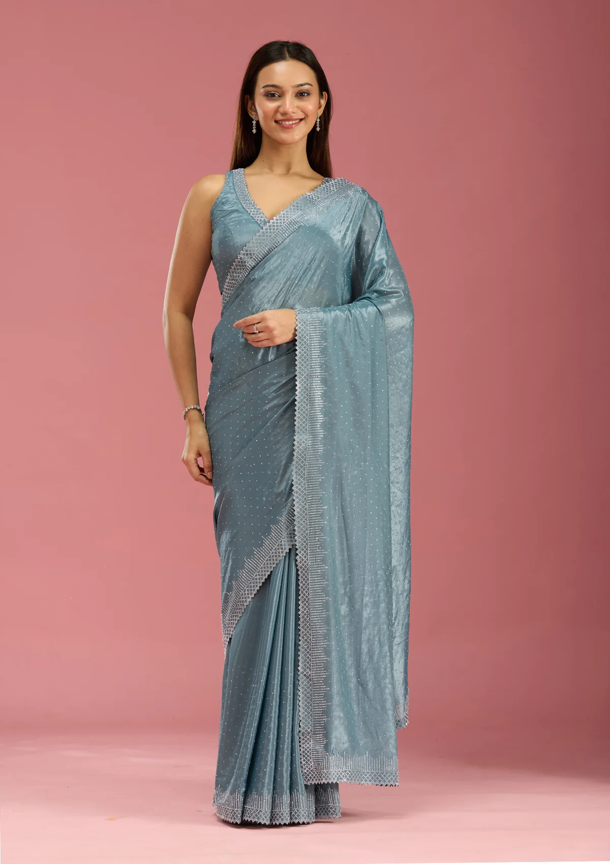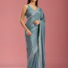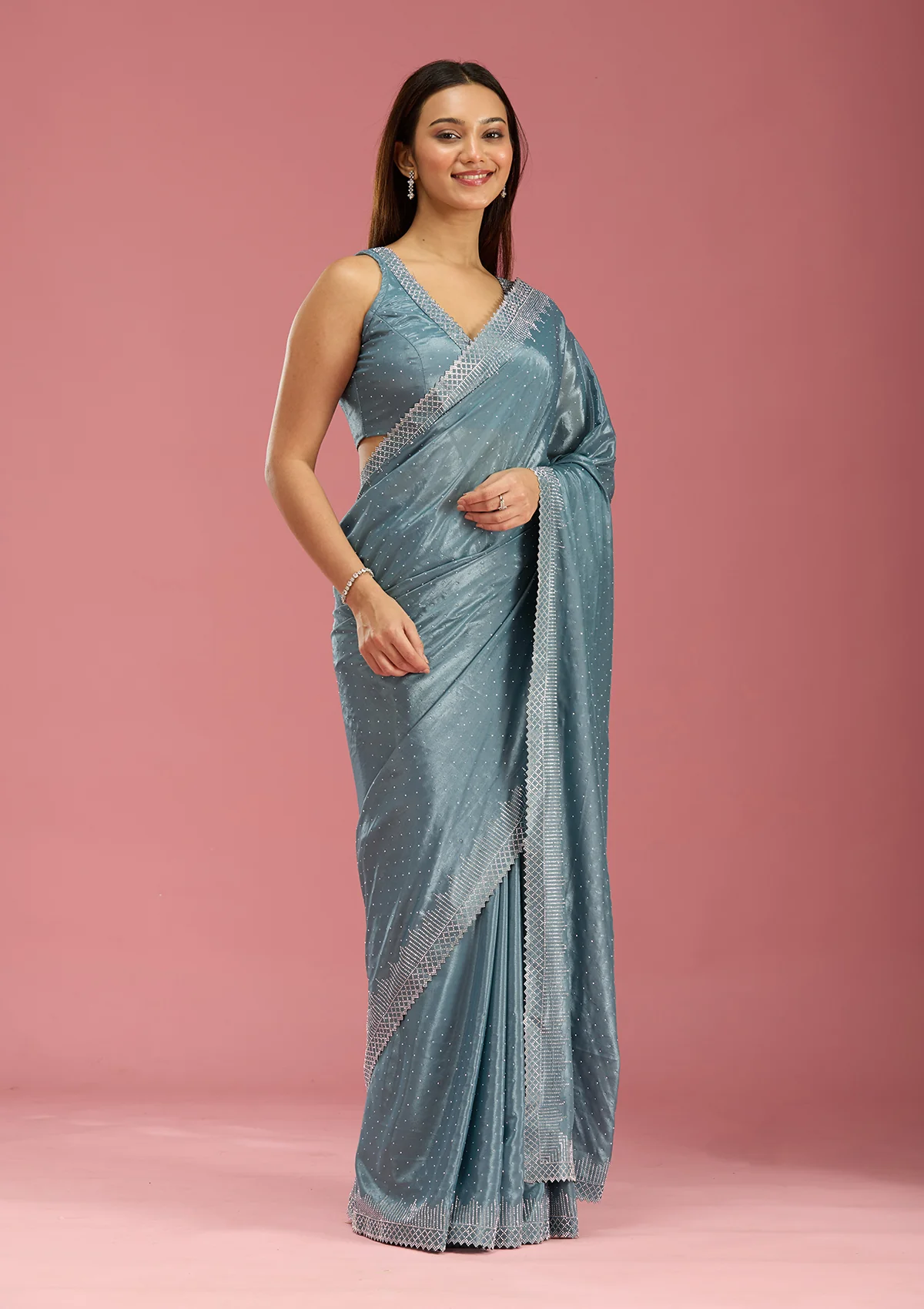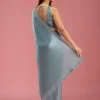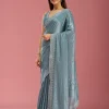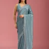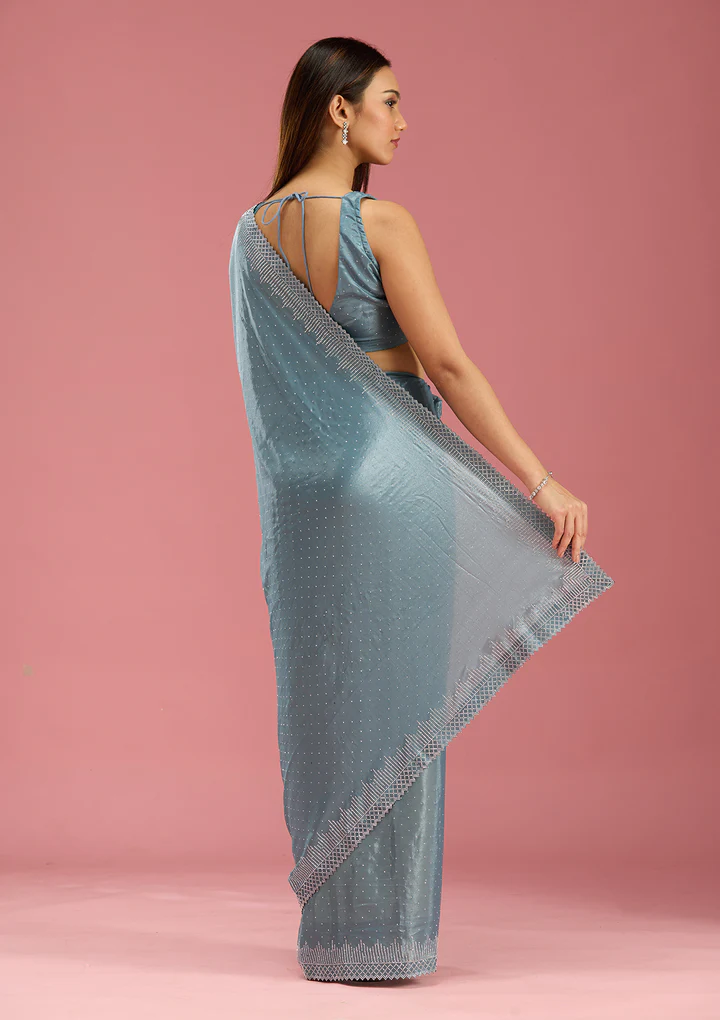 Teal Green Saree in Satin fabric. The Saree is elevated with Stonework (Silver) embroidery. It comes with an Unstitched blouse. Comes with the Wearfella Trends promise of premium quality.