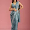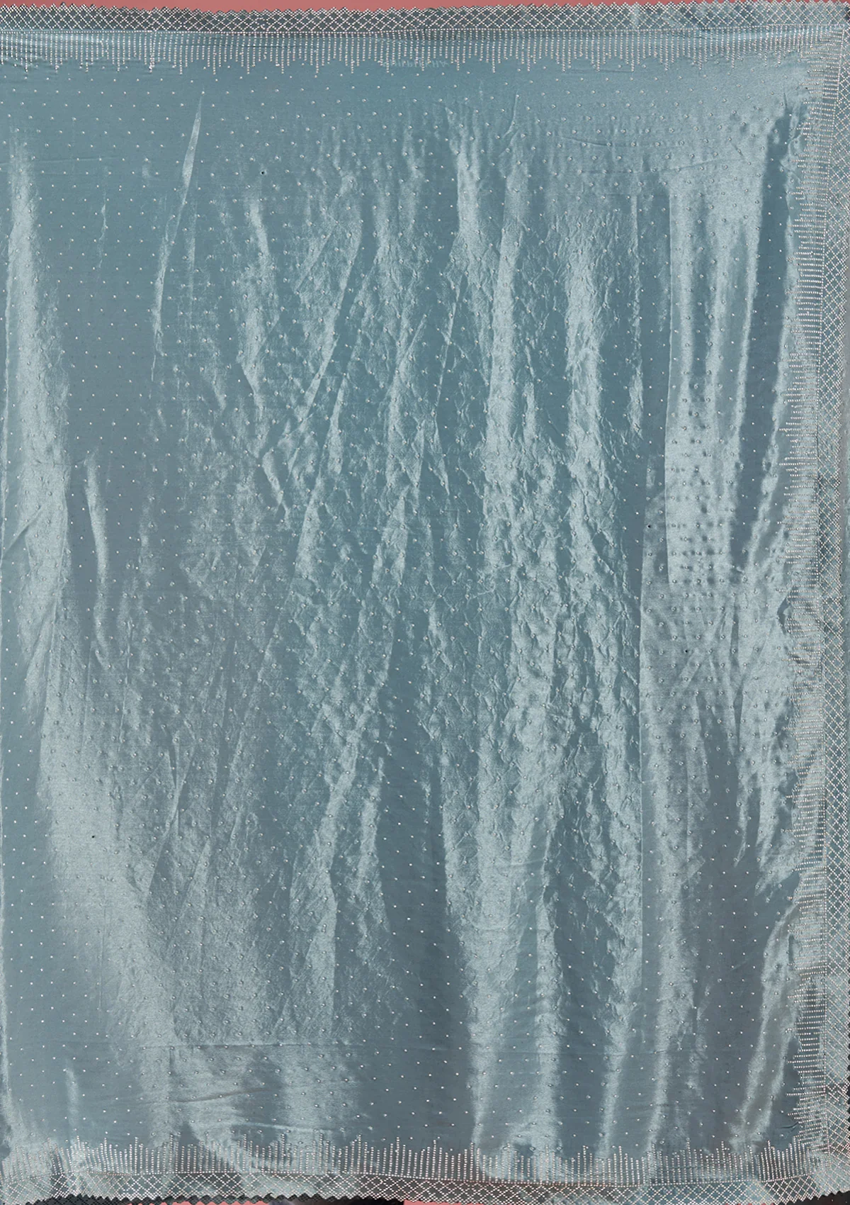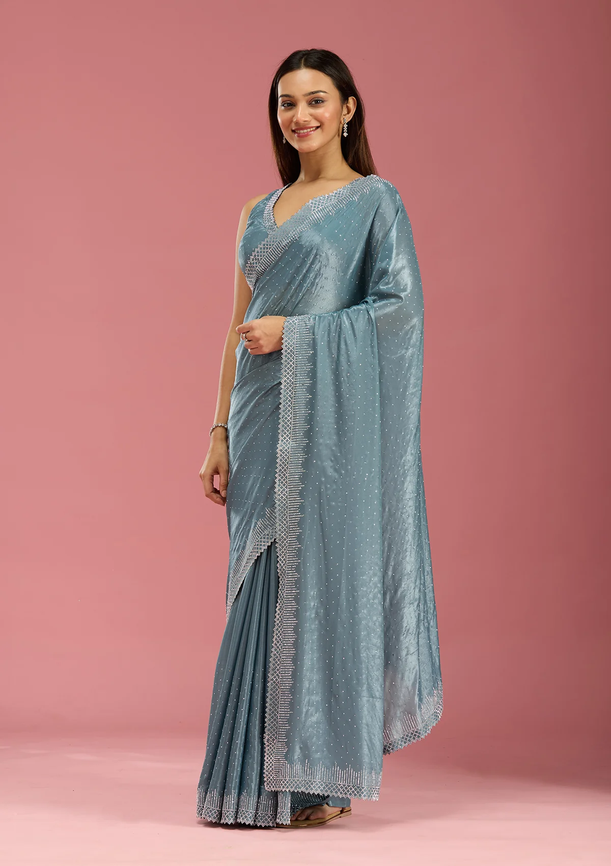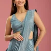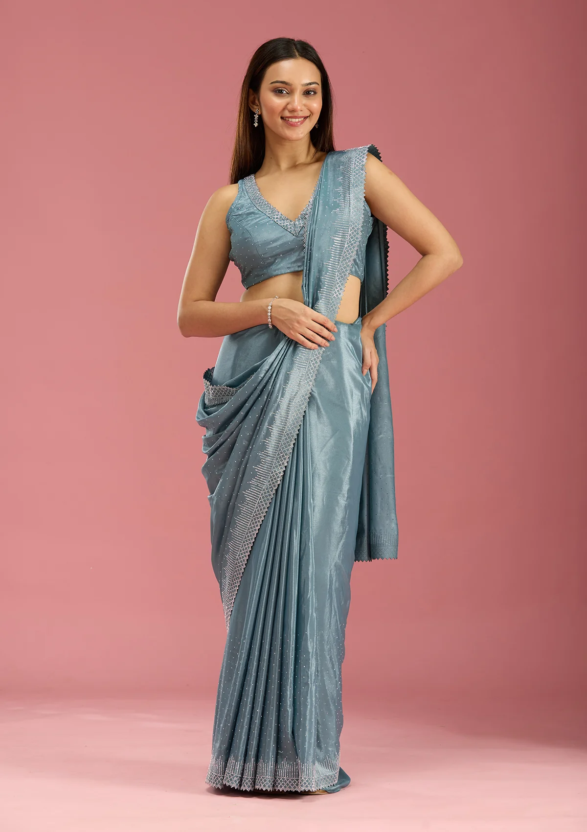 Teal Green Saree in Satin fabric. The Saree is elevated with Stonework (Silver) embroidery. It comes with an Unstitched blouse. Comes with the Wearfella Trends promise of premium quality.