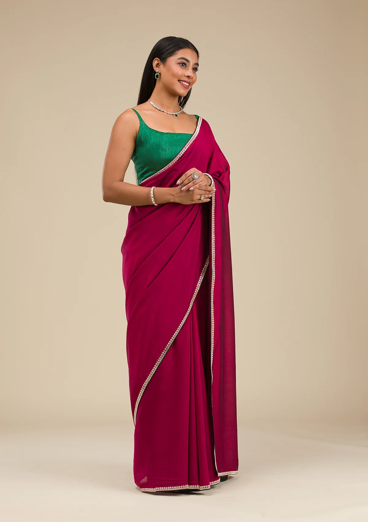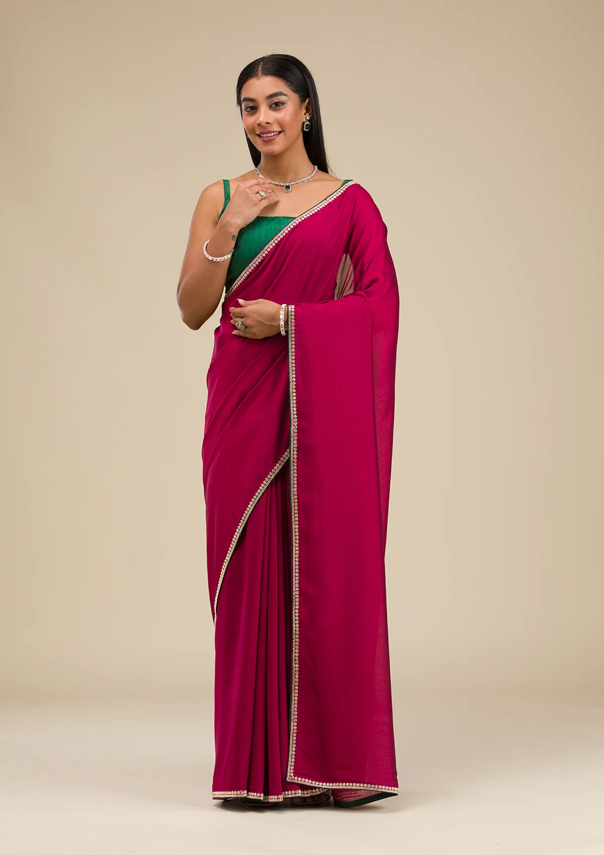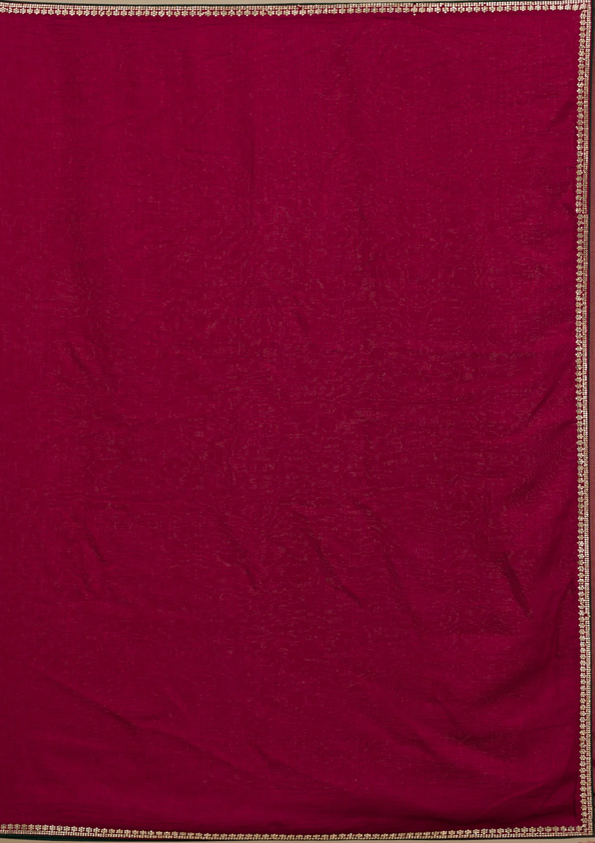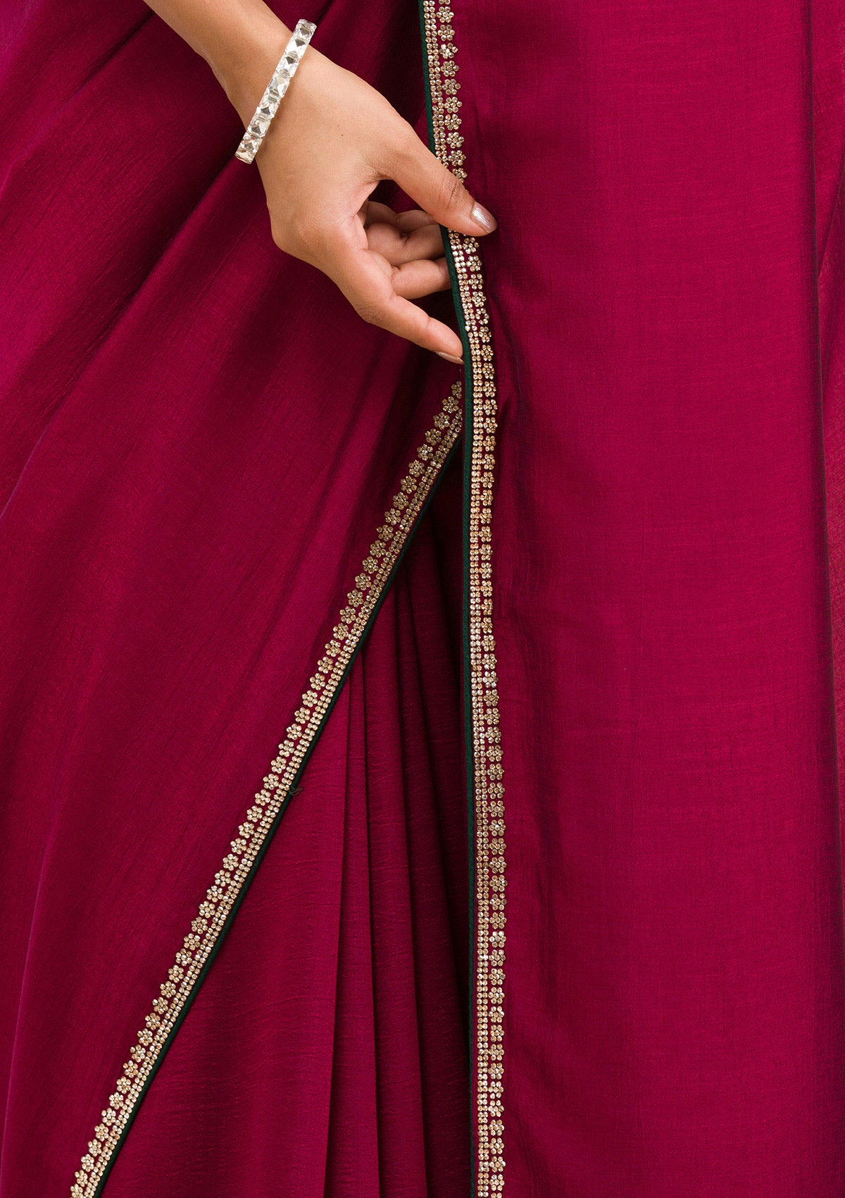 Unveil your vibrant side with Wearfella Trends magenta soft raw silk saree, a testament to timeless elegance with a contemporary twist! This exquisite piece, adorned with shimmering gold stonework embroidery, fits seamlessly into any sophisticated wardrobe, promising a splash of spirited charm at your next gathering. Feel the luxurious touch of soft raw silk as it gracefully drapes, highlighting every move you make with an enchanting sparkle.