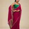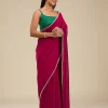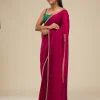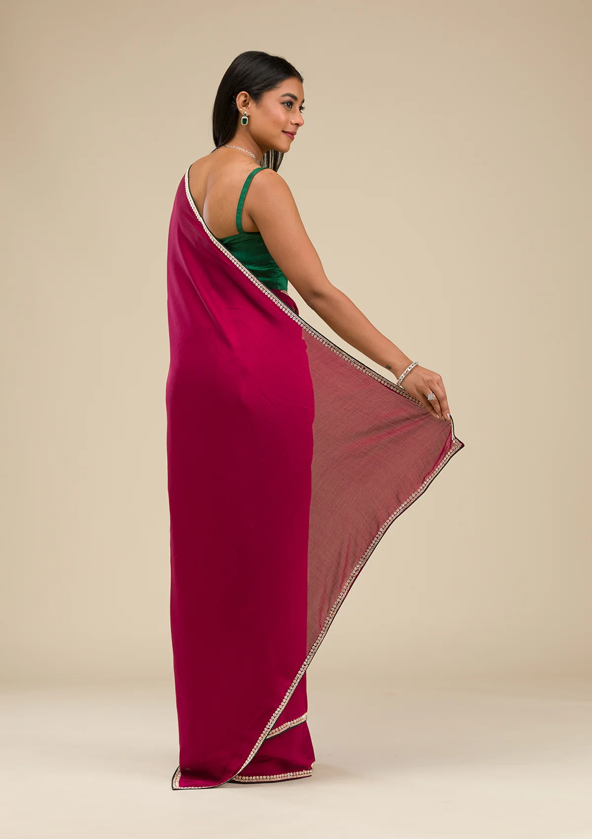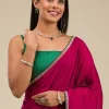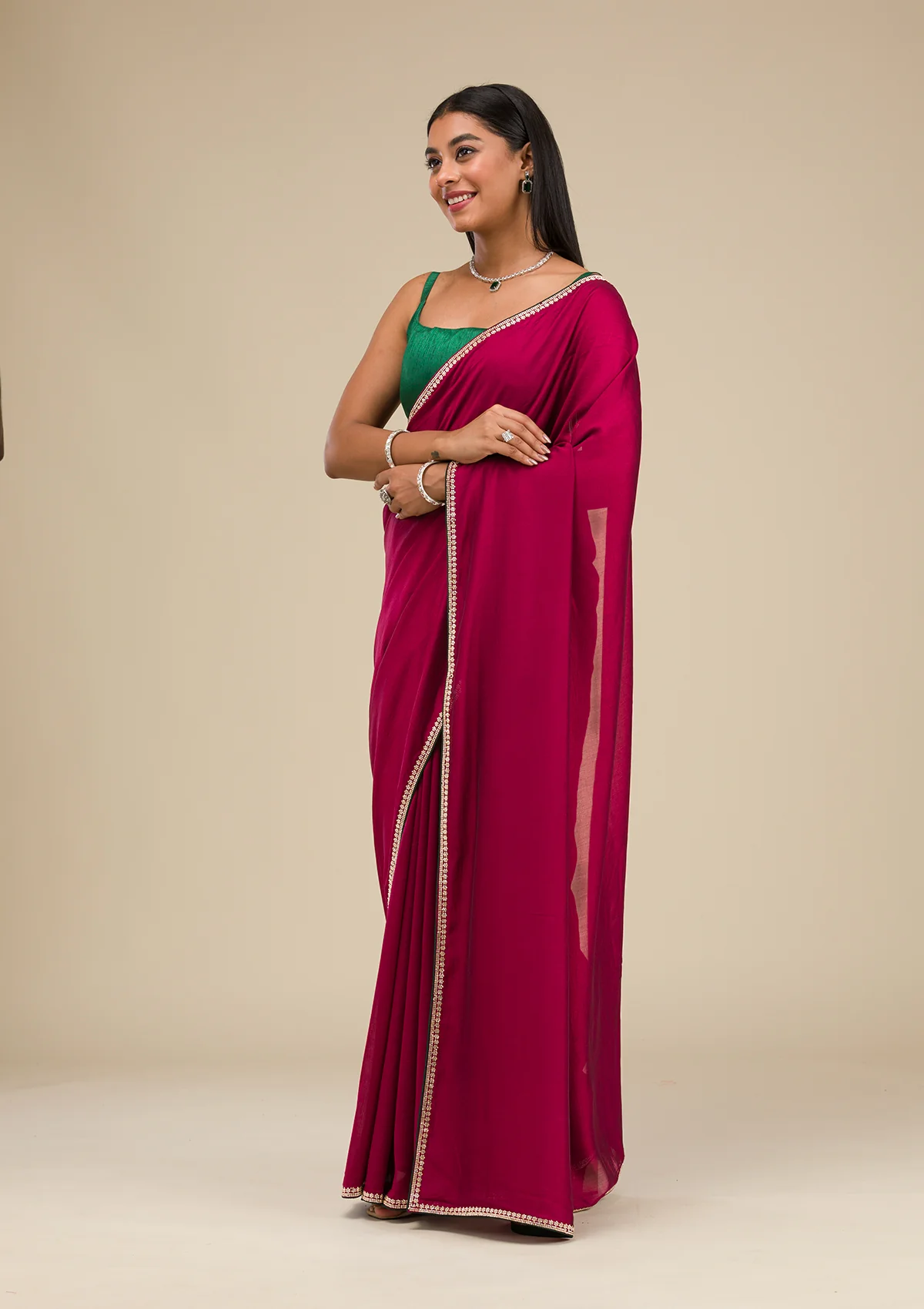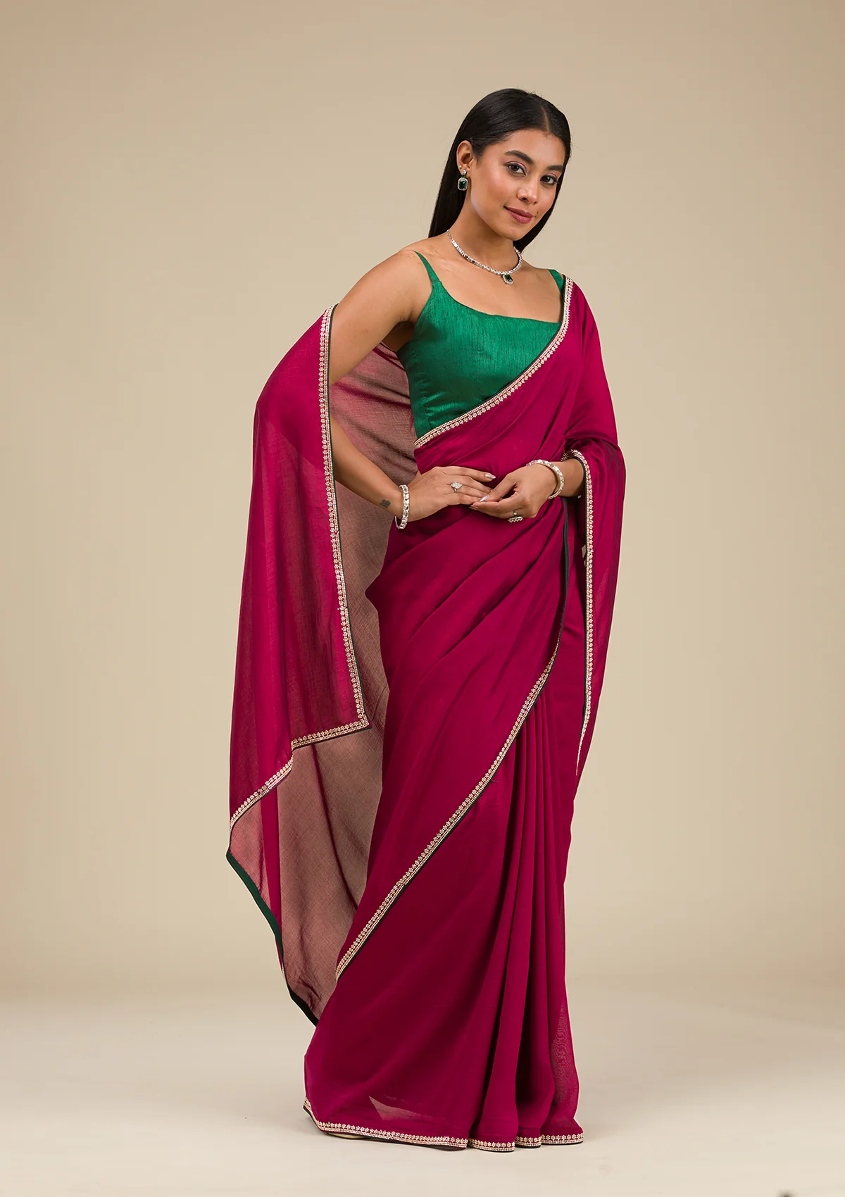 Unveil your vibrant side with Wearfella Trends magenta soft raw silk saree, a testament to timeless elegance with a contemporary twist! This exquisite piece, adorned with shimmering gold stonework embroidery, fits seamlessly into any sophisticated wardrobe, promising a splash of spirited charm at your next gathering. Feel the luxurious touch of soft raw silk as it gracefully drapes, highlighting every move you make with an enchanting sparkle.