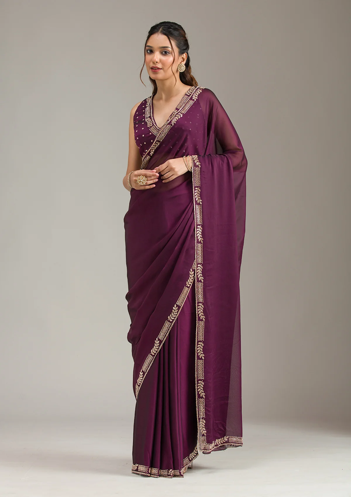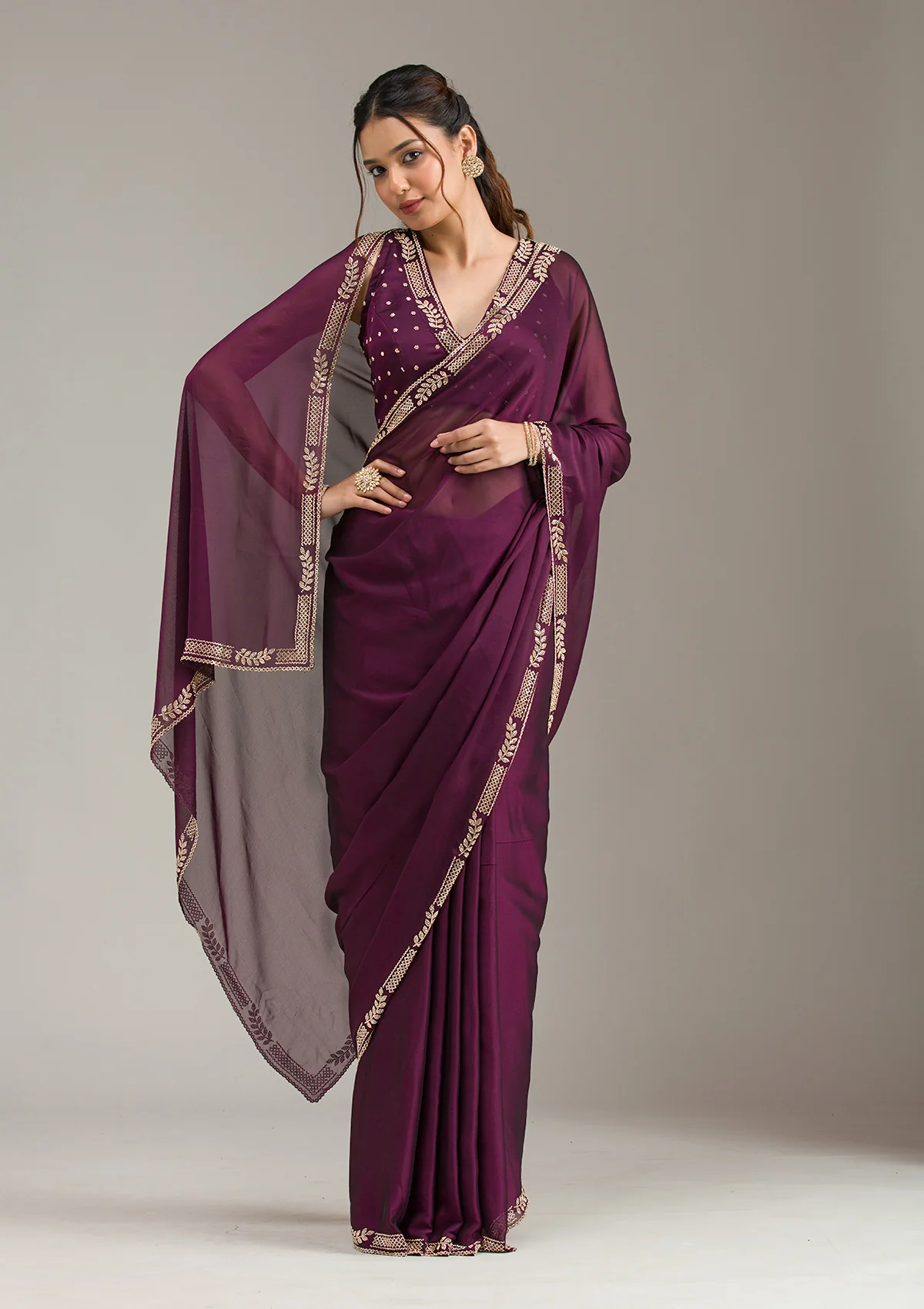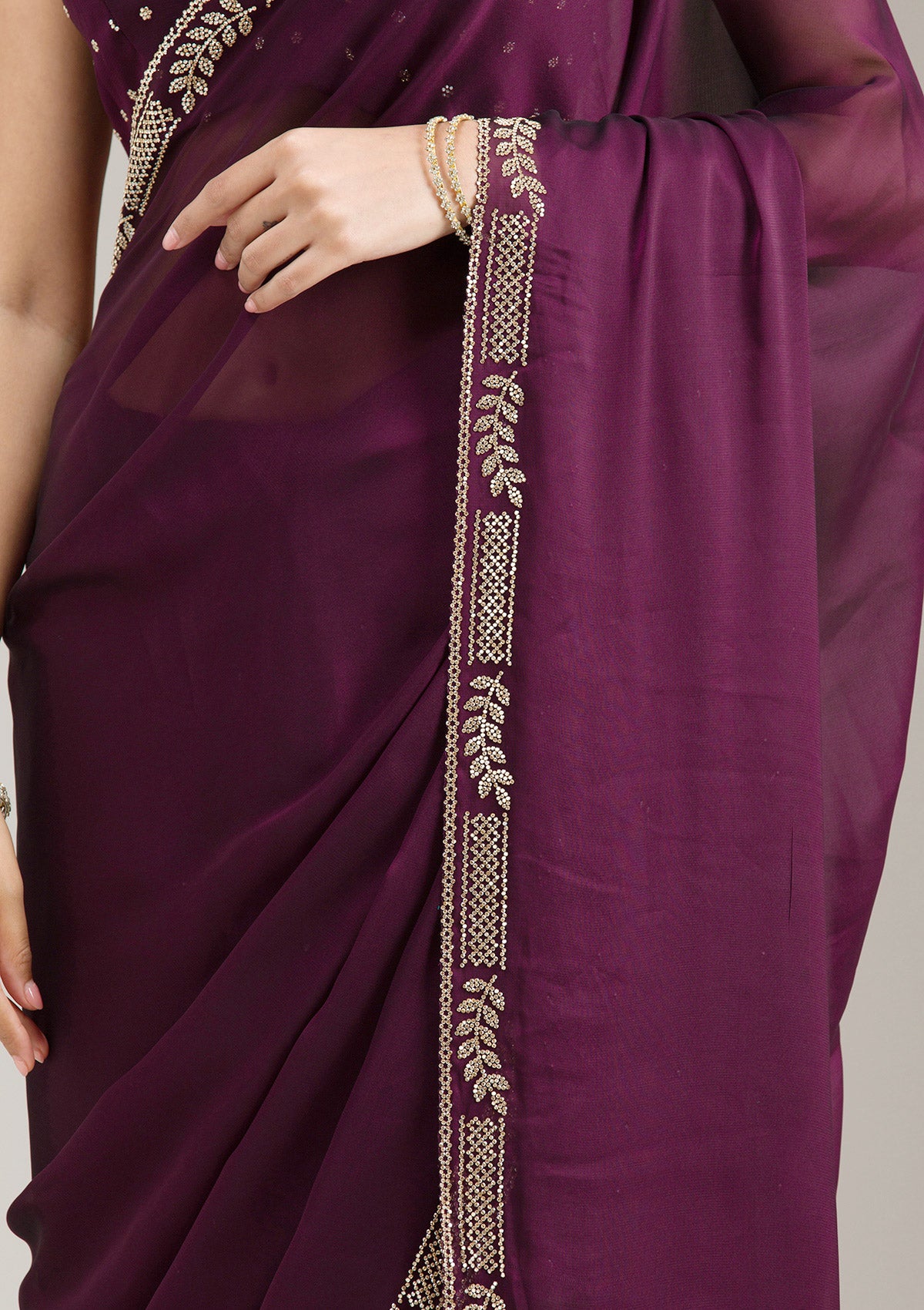 Wine Saree in Georgette fabric. The Saree is elevated with Stonework (Gold) embroidery. It comes with an Unstitched blouse. Comes with the Wearfella Trends promise of premium quality.