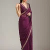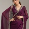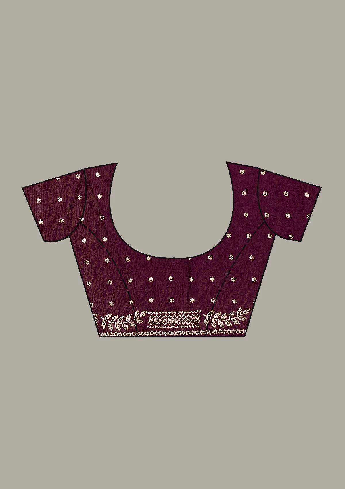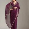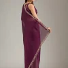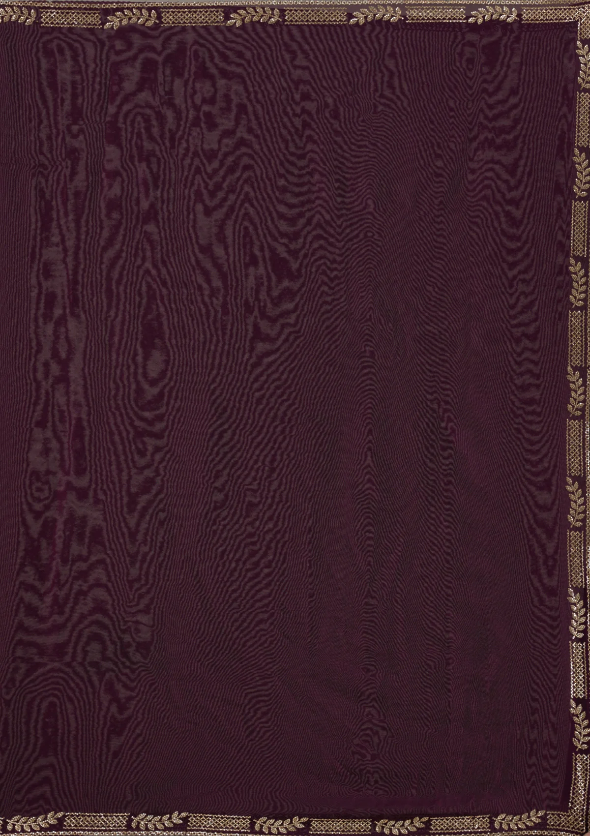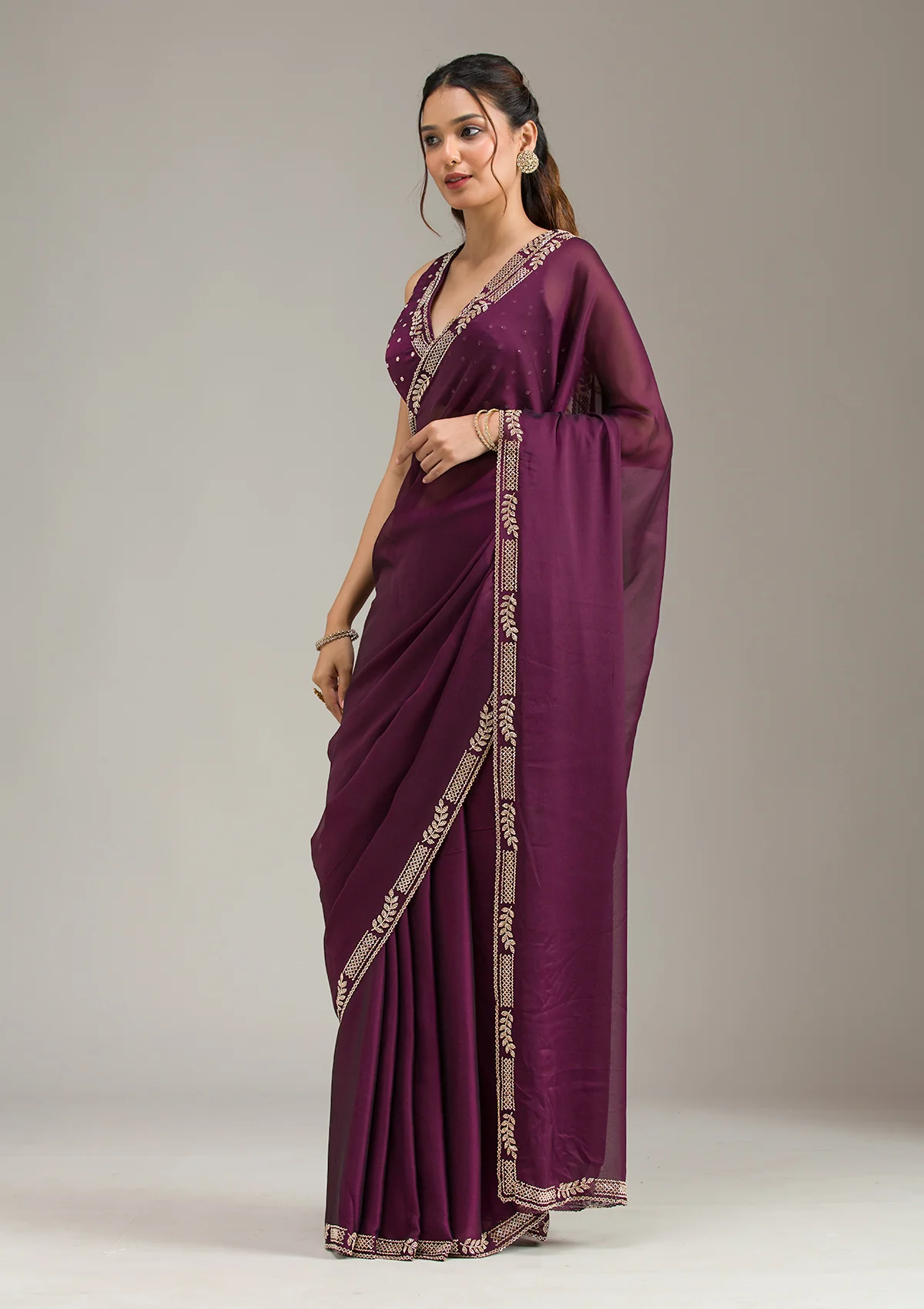 Wine Saree in Georgette fabric. The Saree is elevated with Stonework (Gold) embroidery. It comes with an Unstitched blouse. Comes with the Wearfella Trends promise of premium quality.